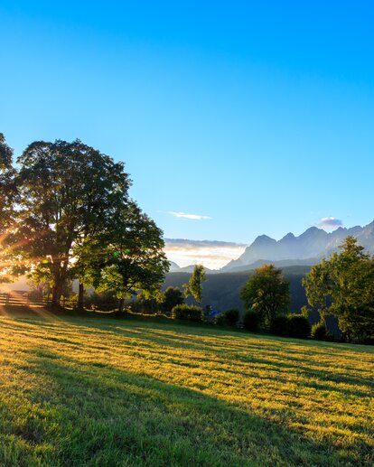 Sunlight beams through trees onto a meadow in Rohrmoos, with the mountains of the Schladminger Tauern in the background | © photo austria