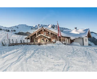 Traditional alpine hut in the ski area "Hahnbaum" in the city centre of Sankt Johann im Pongau. Directly next to the top station of the 2-men chairlift "Hahnbaum".