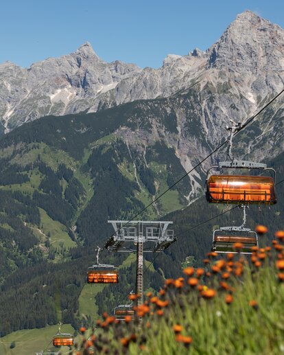 Orange chairlifts of Hochmaisbahn float above alpine slopes and blooming meadows in summer near Hochkönig. | © Roland Haschka