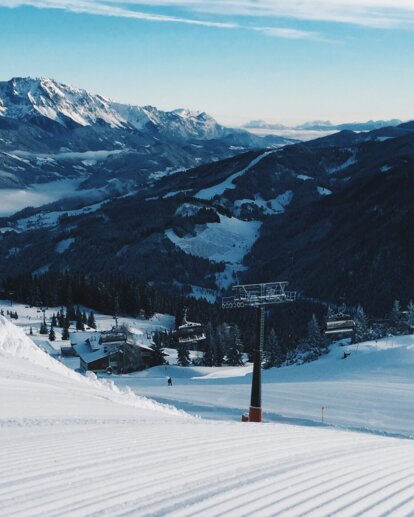 Freshly groomed ski slope with a chairlift and snowy mountains. | © Ski amadé