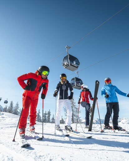 Skiers in colourful ski suits stand on the piste with the gondola hovering above them and one of them has lifted a ski. | © Ski amadé