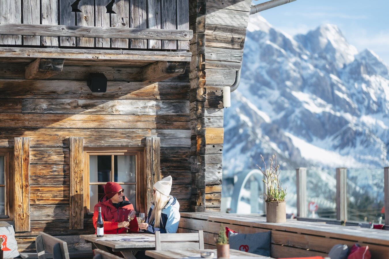 Empty sunny terrace with wooden tables and snowy mountains, two people sitting by the hut | © Ski amadé