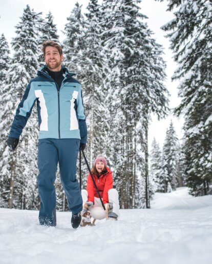 A man pulls a laughing woman on a sled along a snowy forest path. | © Ski amadé