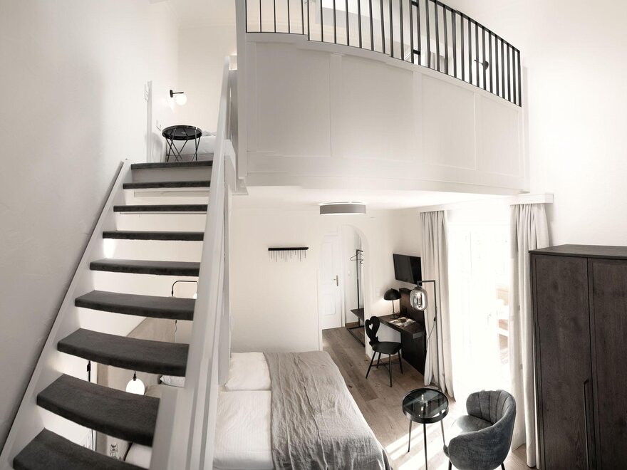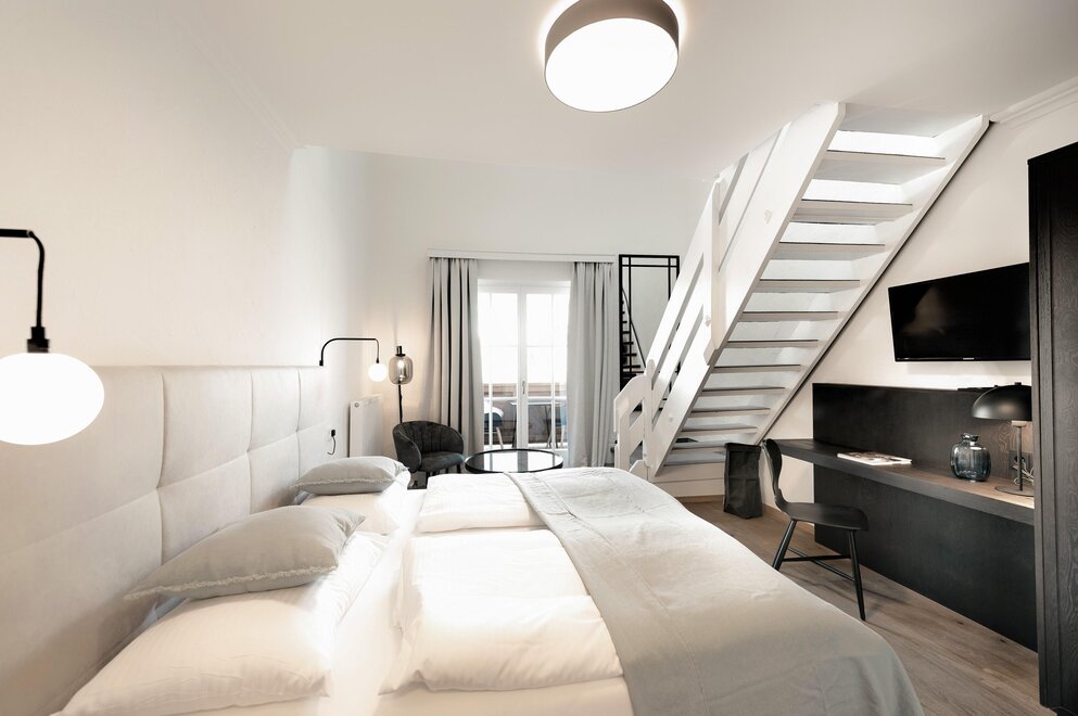Életstílus szoba, kényelmes boxspring ágy, elegáns fa padló, hangulatos életstílus fotelek, fürdőszoba fényzuhannyal és zenei dobozokkal, síkképernyős TV, WLAN és pihenőlounge az erkélyen.25 m2