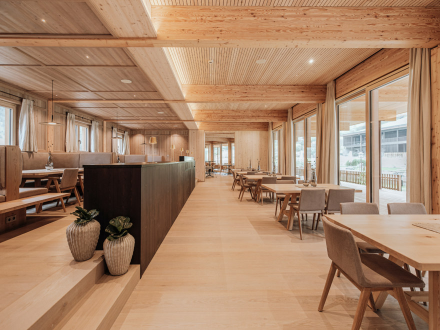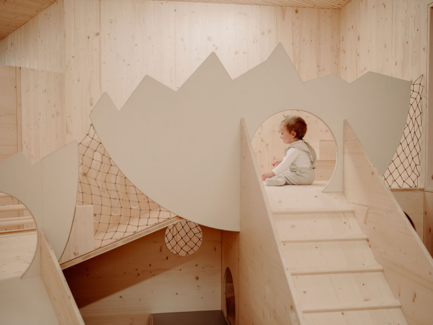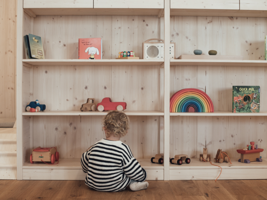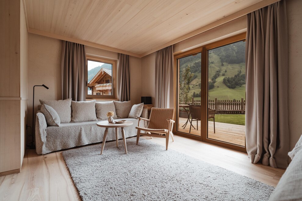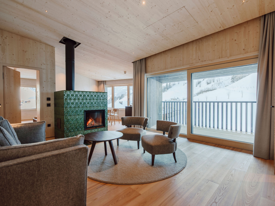 Családi lakosztály Salbei fenyő tömörfából - 68 m² - szülői hálószoba és különálló gyermek hálószoba dupla- és emeletes ággyal, külön nappali, WLAN, telefon beépített babafigyelő rendszerrel, széf, Sky TV, fürdőszoba dupla mosdóval, zuhanyzó, kozmetikai tükör, hajszárító, külön WC, hűtőszekrény, vízforraló, Nespresso kávéfőző, kandalló, erkély vagy terasz. Tömör fenyőből berendezve a különleges kényelem érdekében.