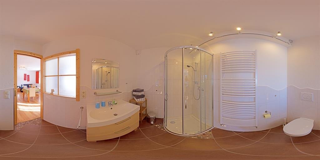 Fließendes Kalt- und Warmwasser, Dusche, WC, Doppelwaschbecken, Separates WC