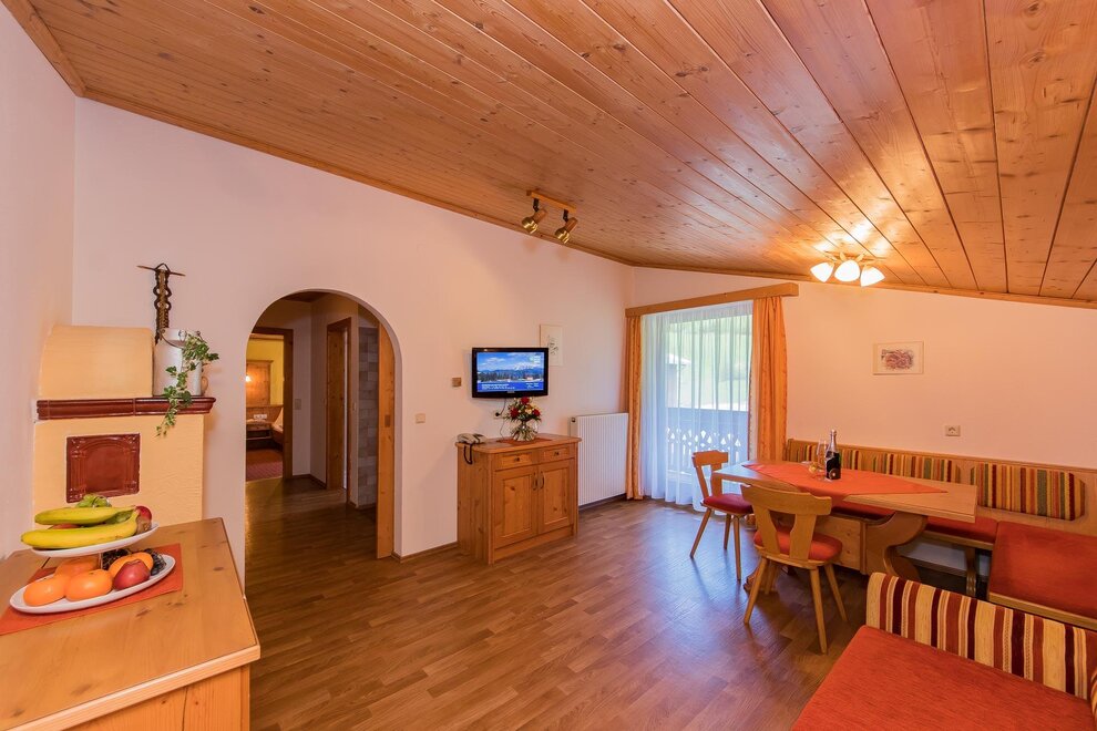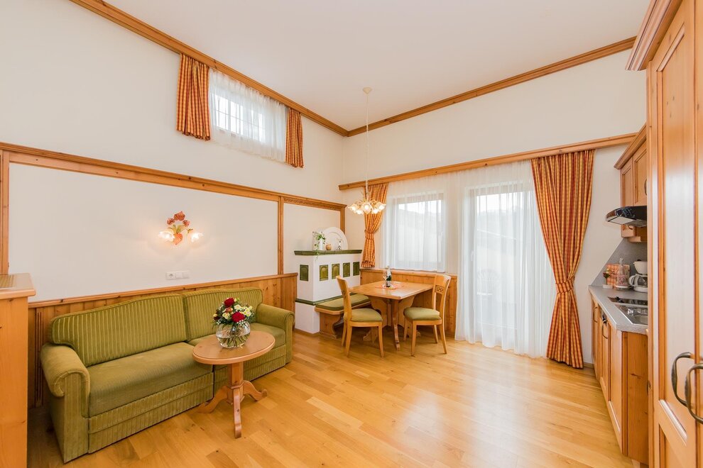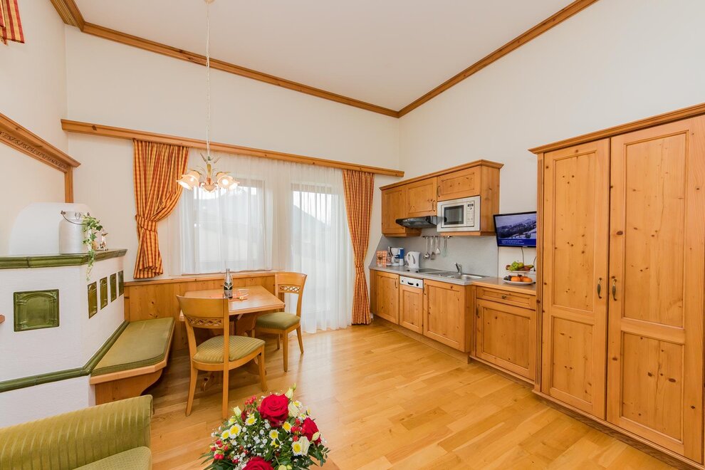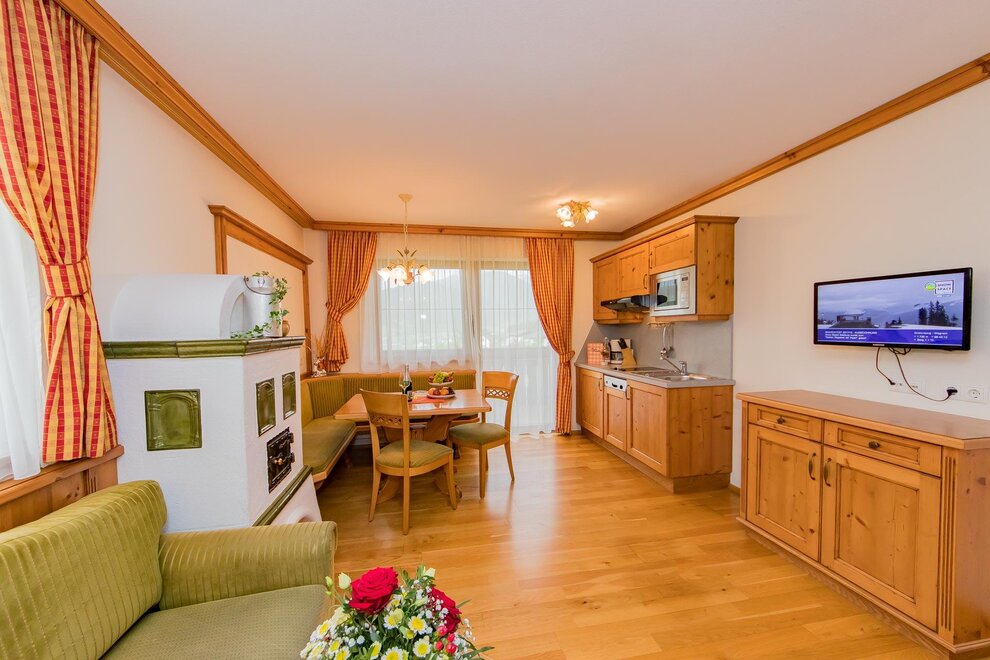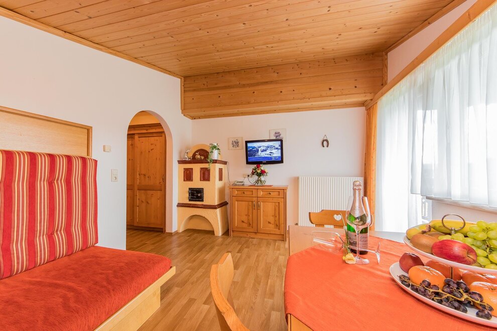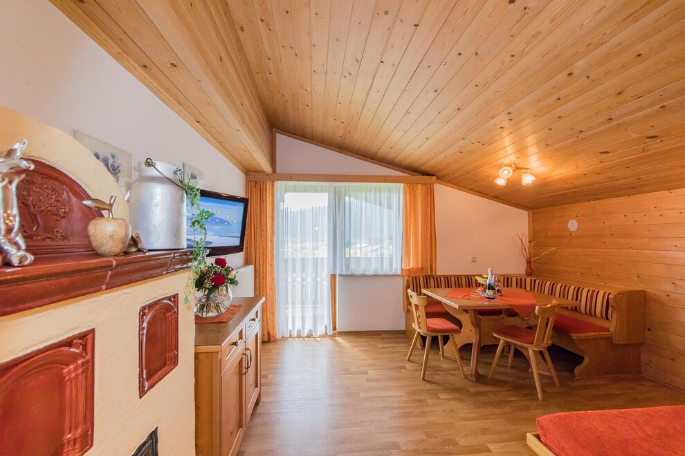 Bettwäsche vorhanden, Balkon, Küchenzeile, Geschirrspülmaschine, Kaffee-Maschine, Sitzgruppe, Tisch- und Küchenwäsche, Haarföhn, Kabelfernsehen, Telefon, Internetanschlussmöglichkeit, Wohn-/Schlafräume kombiniert, Mikrowelle, Kachelofen, Geschirr vorhanden, Terrasse