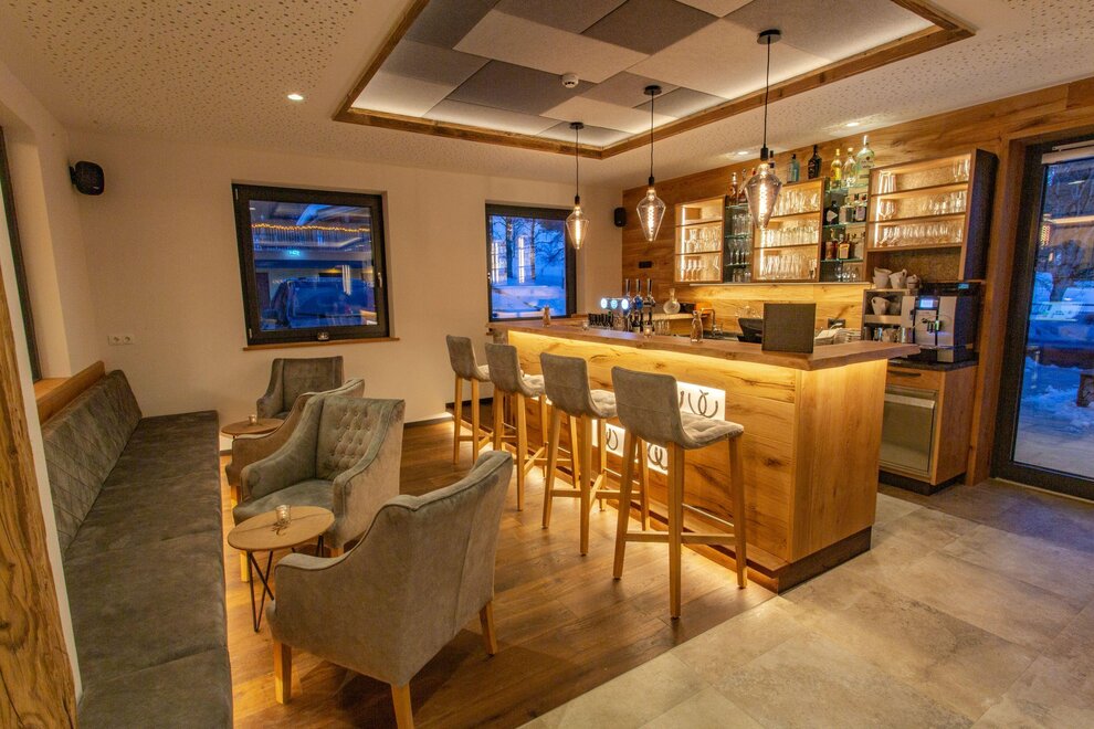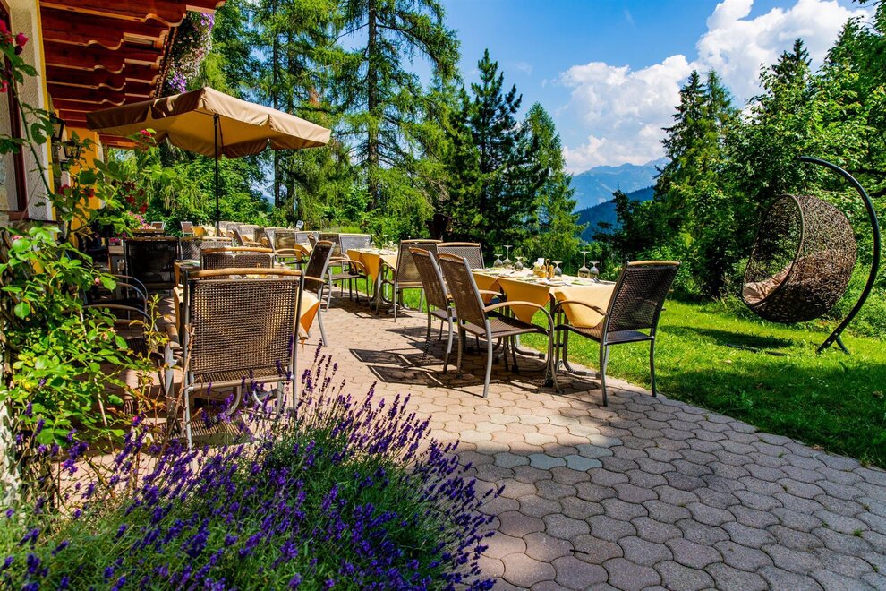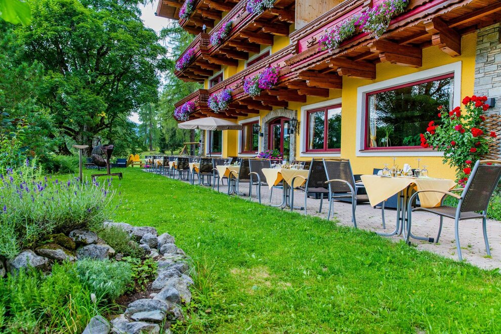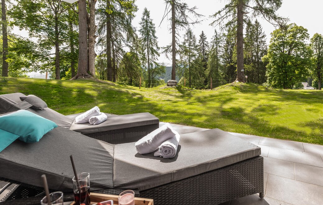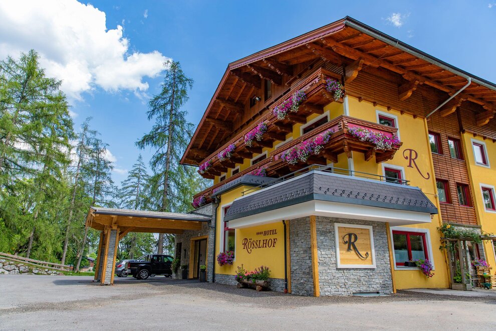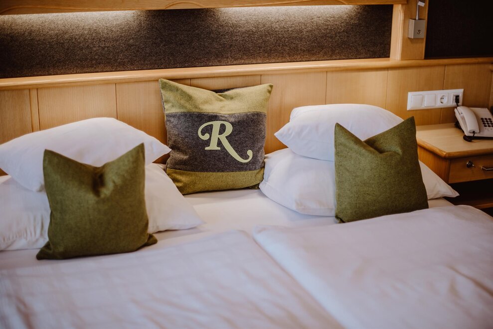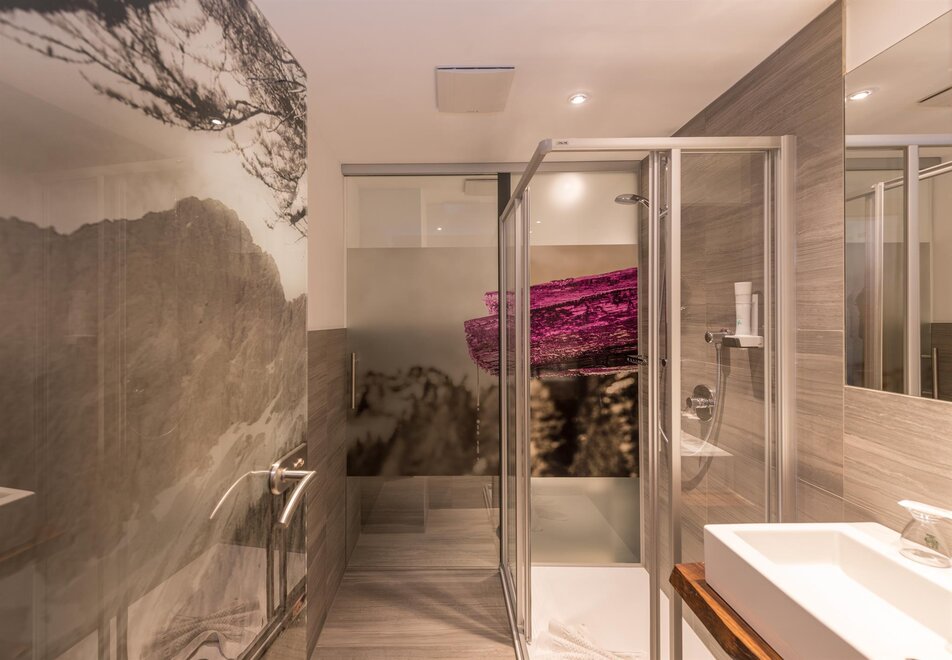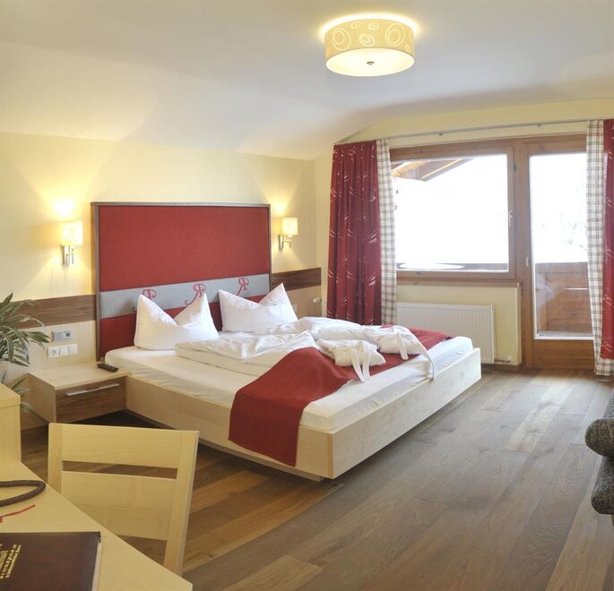 Doppelzimmer Dachstein mit Blick auf die imposanten Dachstein-Südwände; gemütliches Doppelbett mit komfortablen Matratzen, Schreibtisch, Couch, Kabel-TV, Radio, schönes Badezimmer mit Dusche und WC, Balkon