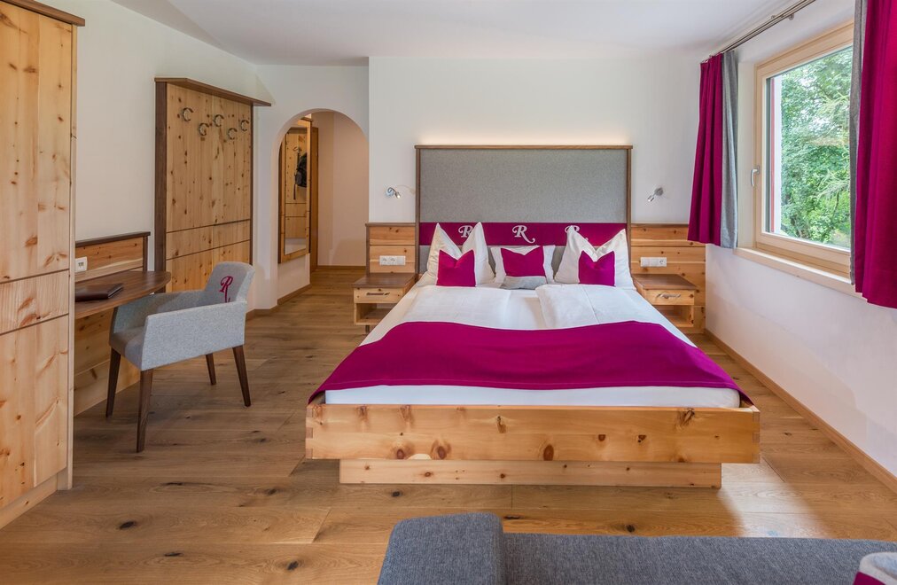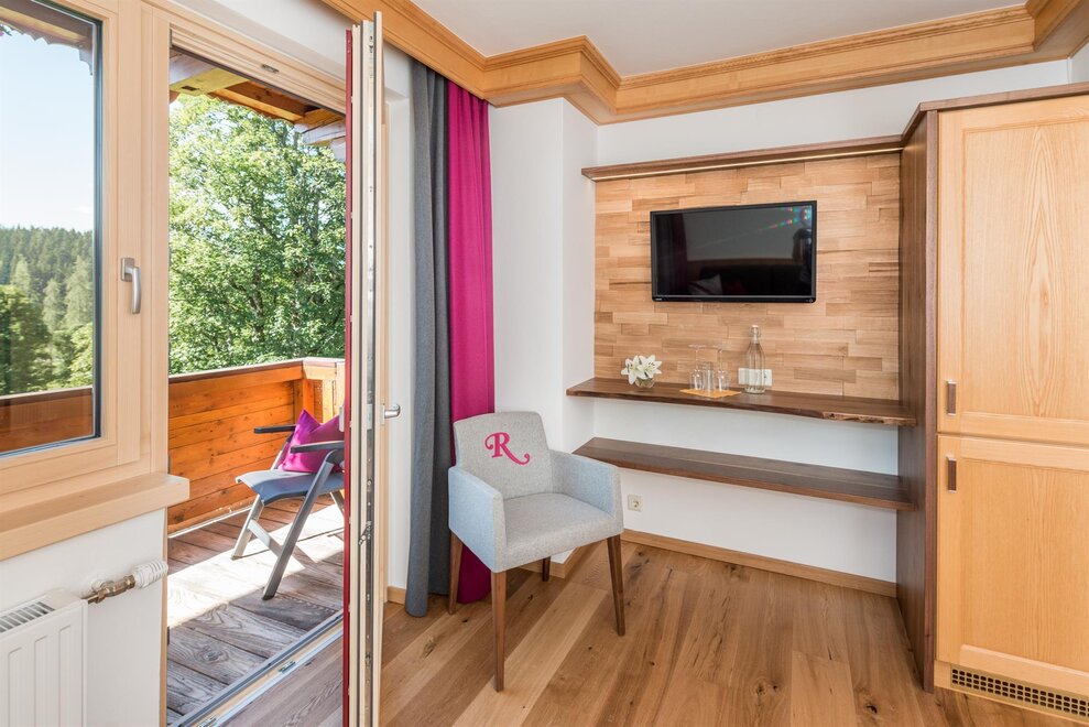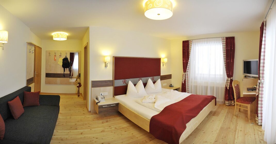 The double rooms south are furnished with modern materials like loden and wood. Cozy double bed with comfortable mattresses, desk, couch, cable TV, radio, nice bathroom with shower and toilet, balcony.