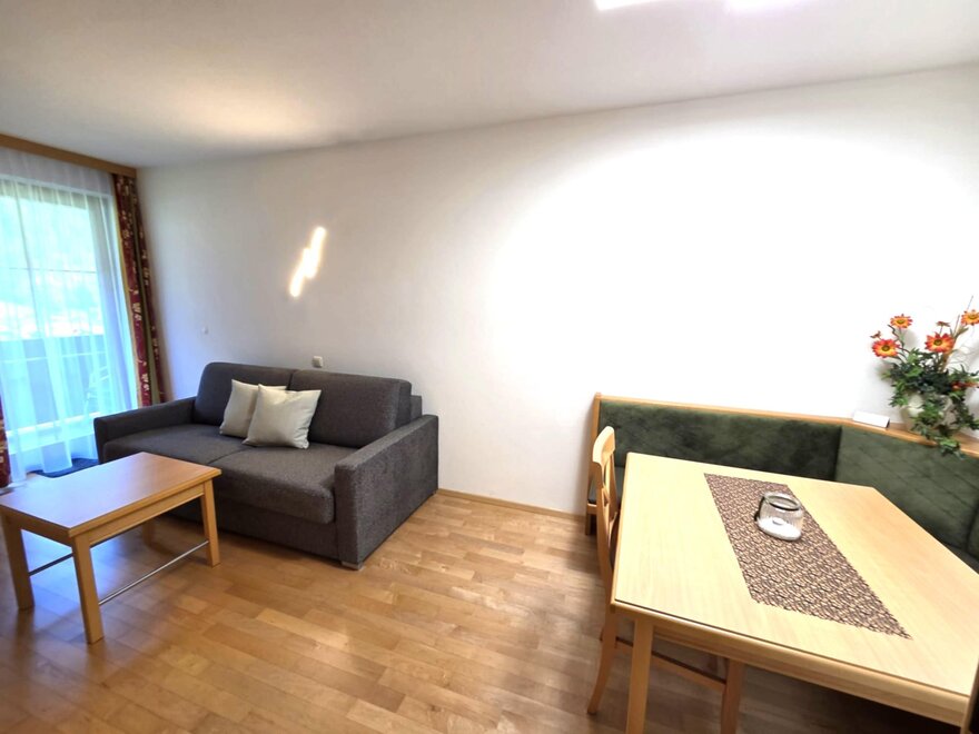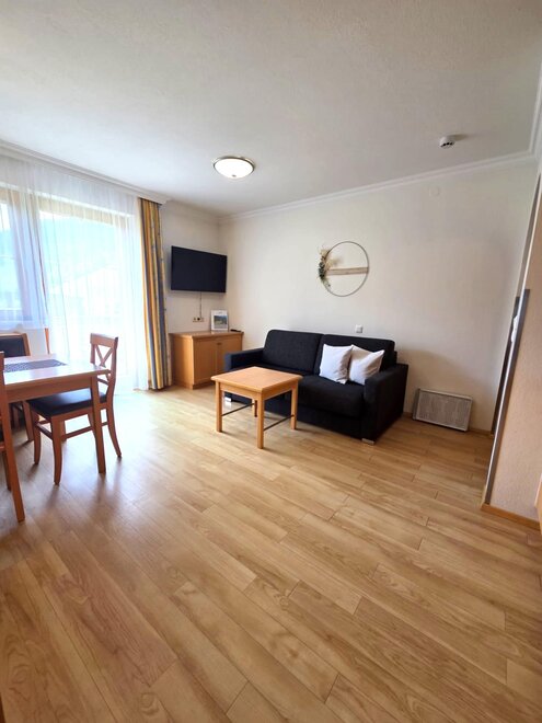46m²: One-Bedroom-Appartement: the spacious apartement has a balcony, bedroom, living room with a sofa bed and dining area; bathroom and toilette;