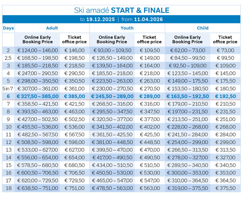 Here is the link to the PDF version of the Ski amadé START & FINALE Multiday ticket prices