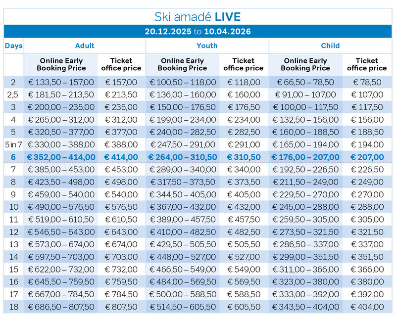 Here is the link to the PDF version of the Ski amadé LIVE Multiday ticket prices