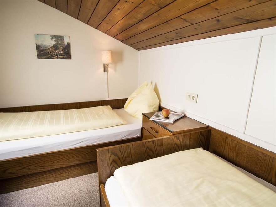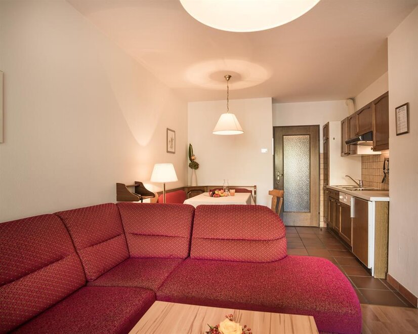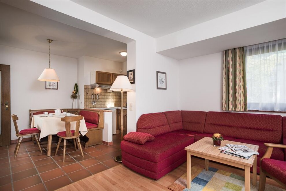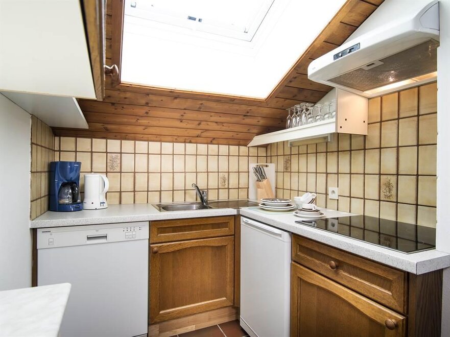 Cozy apartment with 47 m² on the upper floor. Bedroom with 2 single beds seperate, living room with double bed and single bed couch (only for 1 child), kitchen with dishwasher, dining area, 1 bathroom, extra toilet, and a balcony with furniture (northside). The lift reaches to the 3rd floor- this apartment is located on the 4th floor and is accessible via a staircase.