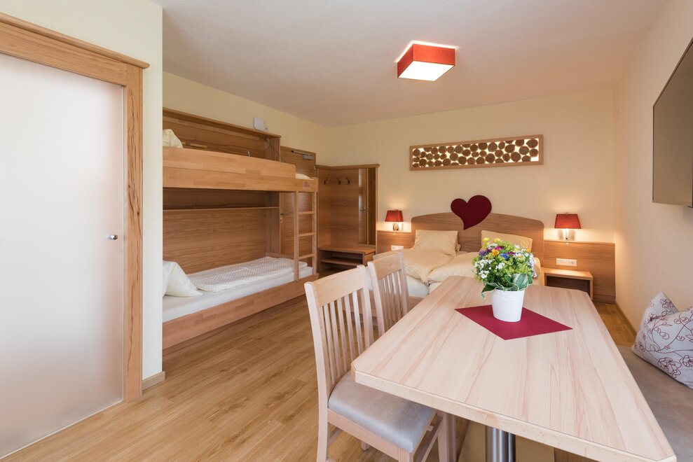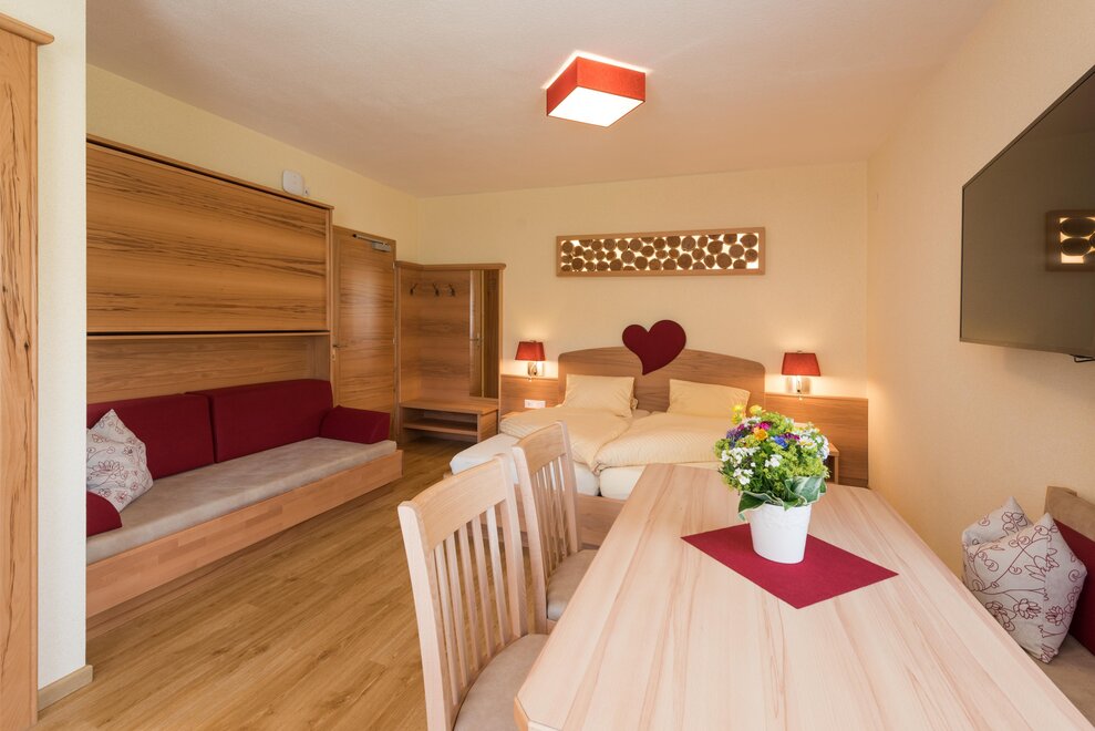 De slaapkamer nodigt met zijn op maat gemaakte meubels van larikshout uit om te ontspannen en energie op te doen. Het is uitgerust met een tweepersoonsbed met hoogwaardige QUL-gecertificeerde relaxmatrassen, kabel-tv en een balkon met uitzicht op de bergen (middagzon). In de badkamer zijn er een wastafel, douche, wc, een royale handdoekradiator en een krachtige föhn. De woonkamer beschikt over een gezellige zithoek met tafel, flat-tv, een volautomatische koffiemachine en een bank. De hele suite heeft vloerverwarming en gratis WiFi.Kenmerken kamer/appartement
