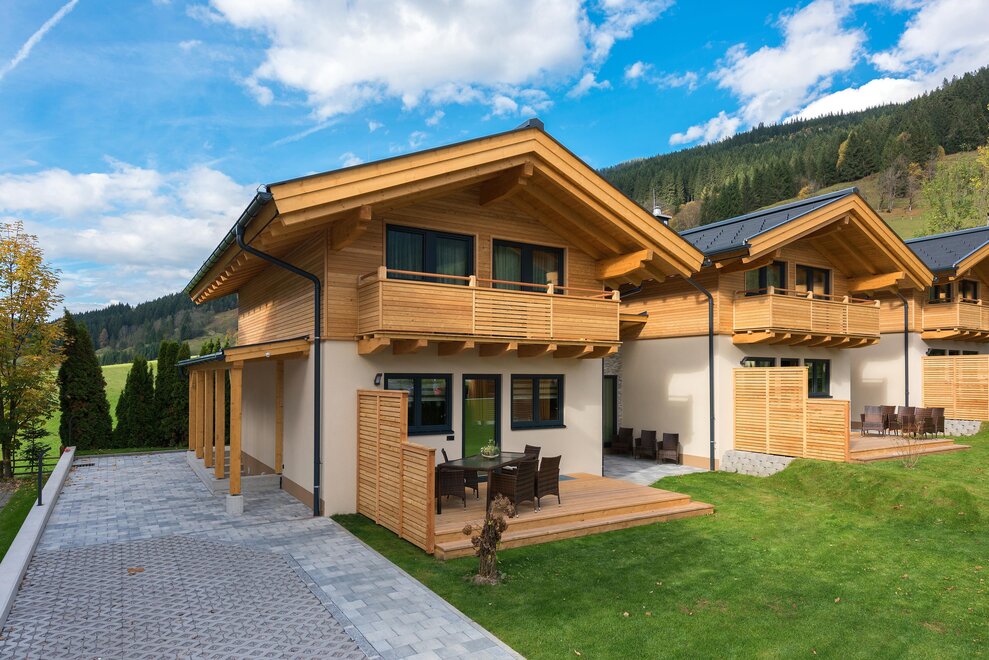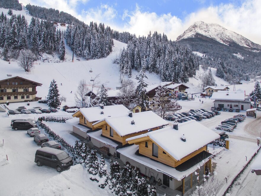 Inchecken: de chalets liggen tegenover het hotel Zirbenhof, de skilift en de uefening piste liggen op 50 meter, het centrum van Kleinarl ligt op 5 minuten lopen