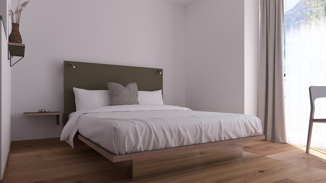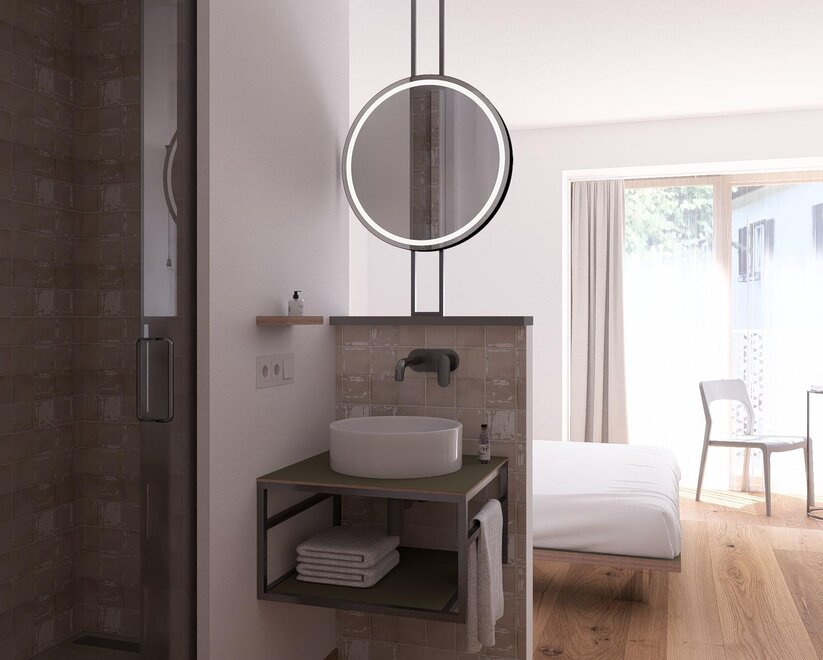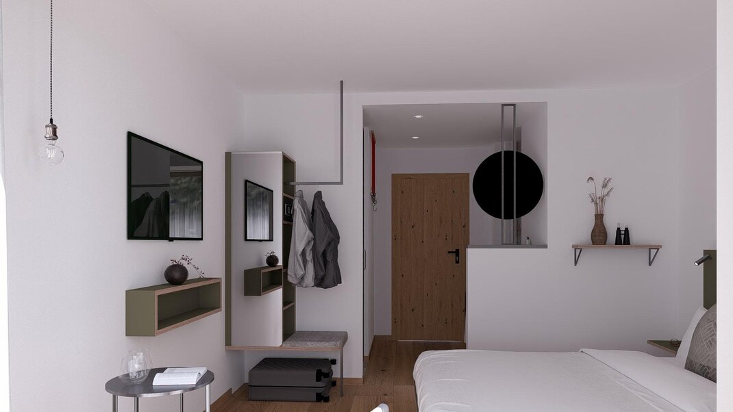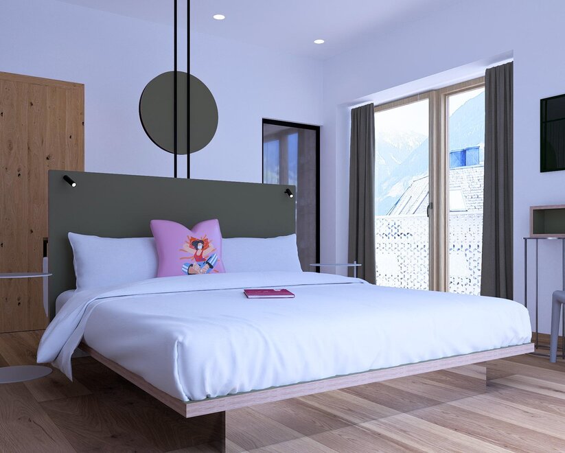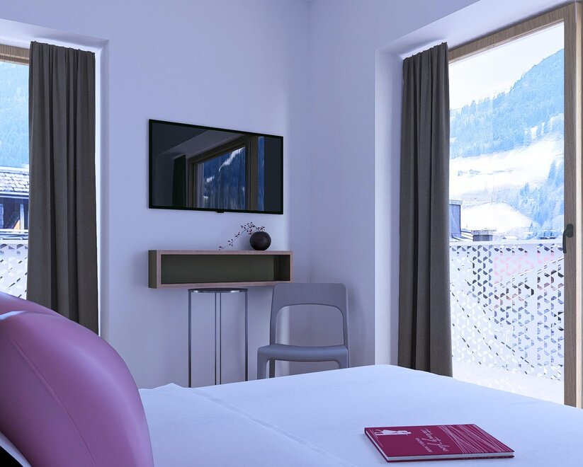 Well-maintained double rooms in the main building, most with balcony and mountain view, with shower or bathtub, toilet, free high-speed WiFi, flat-screen TV, desk and safe. Also possible as a connecting room with a DZ Blü Grand.