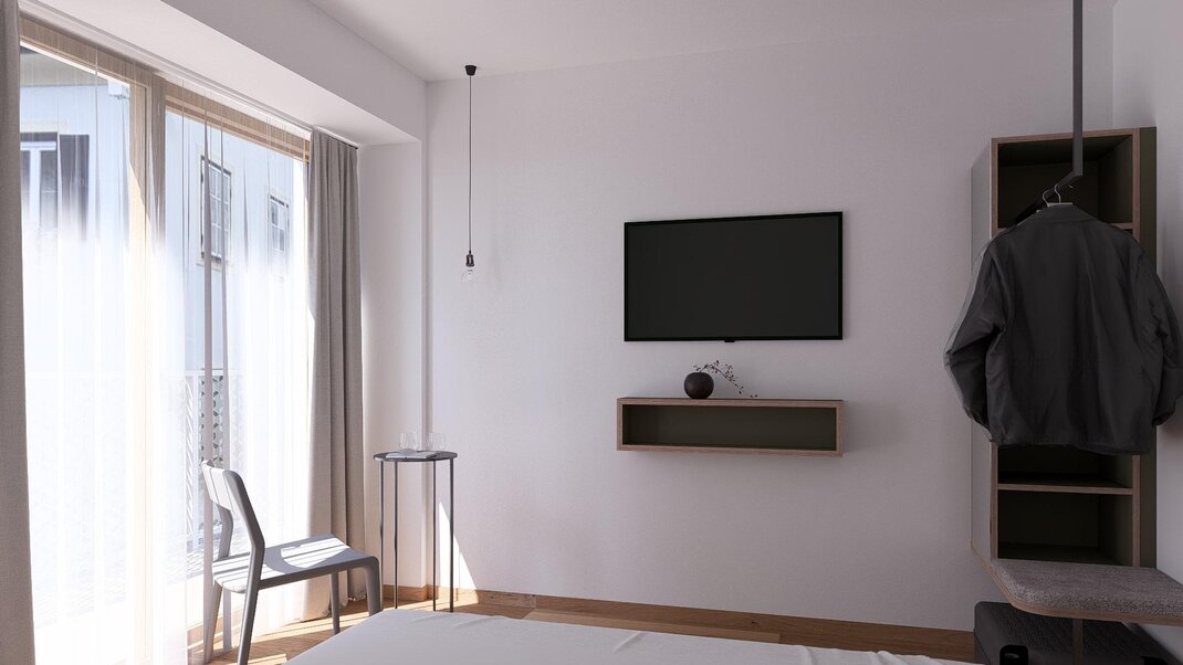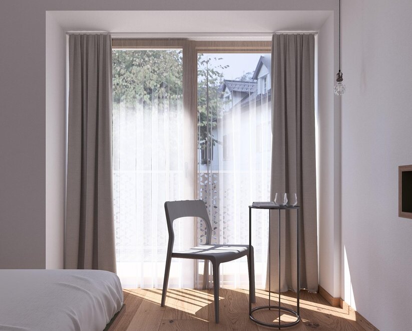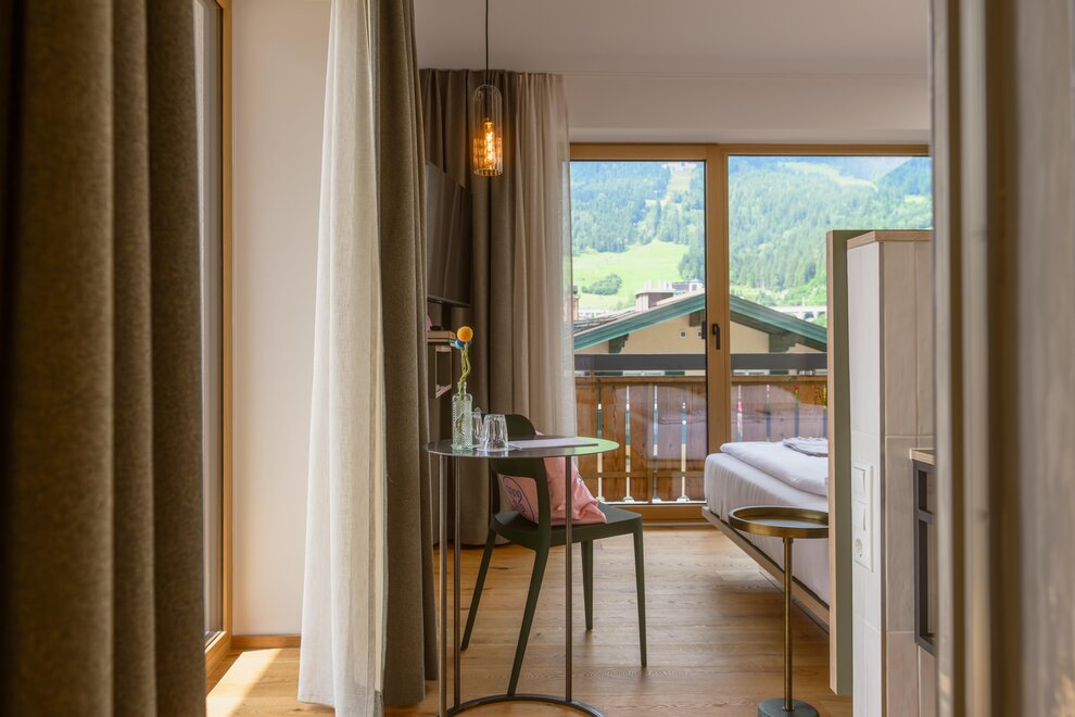 Smart & chic - our Blü single rooms in the main house. Wonderful, west-facing sunny balcony towards Kaiser Franz Platz, with shower or bathtub, toilet, free high-speed WiFi, flat screen TV and safe.
