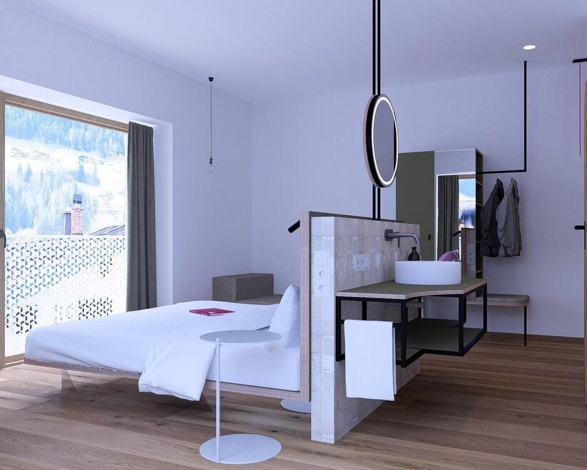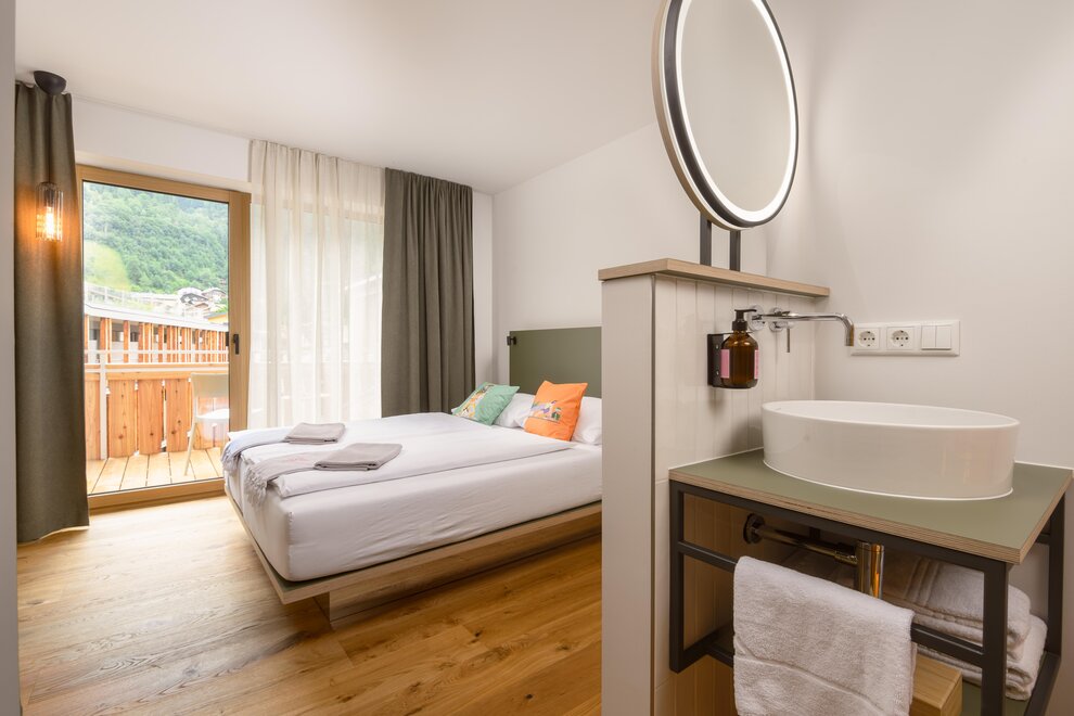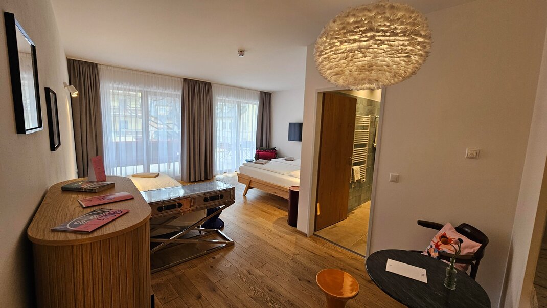 „Vibe voelen“ in urban alpine stijl. Designkamer gerenoveerd in 2025 met houten vloer, balkon, inloopdouche, toilet, open kasten, een ontspannen loungehoek, helder design & zachte kleuren, high-speed WLAN en kluis.