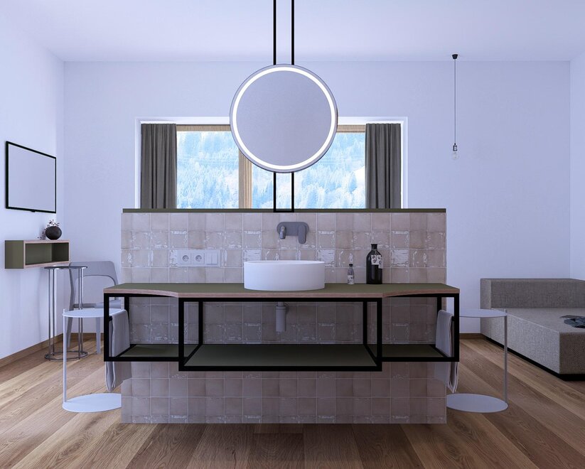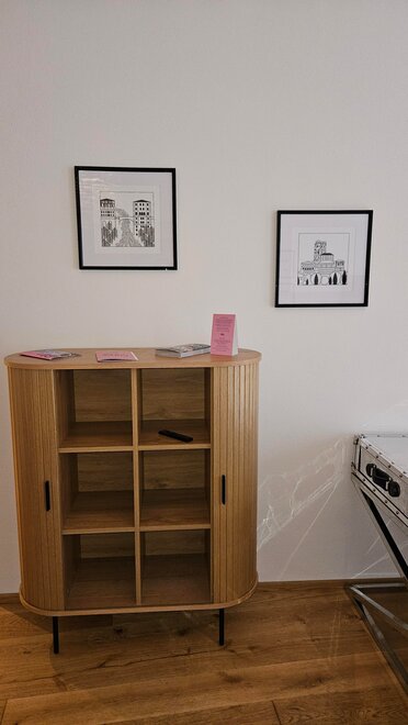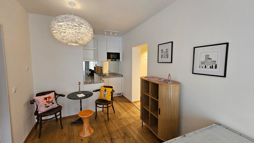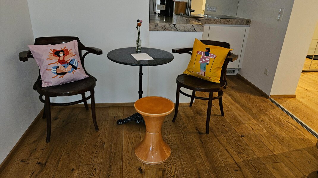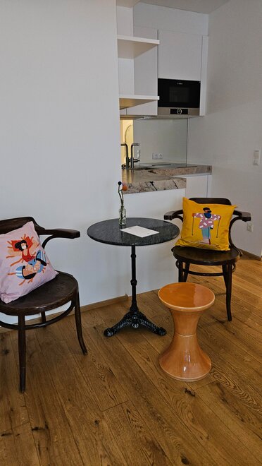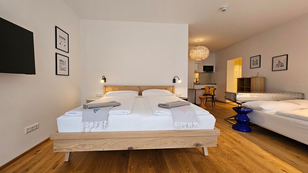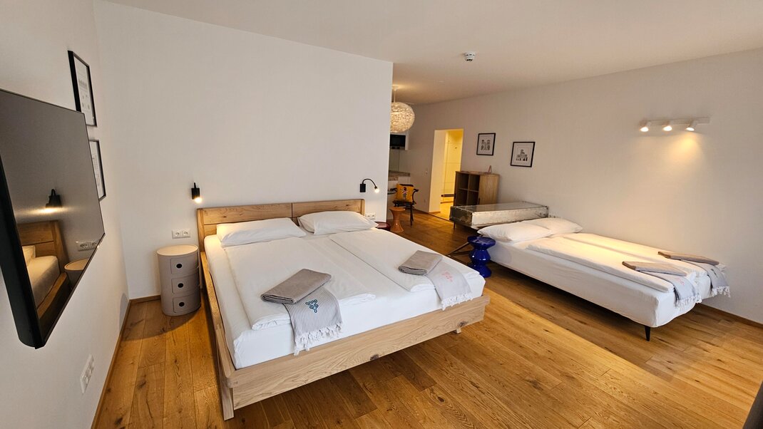 In 2020, the studio was completely renovated and refreshed in 2025. Our new Blü Terrace Studio features 43m² of living space and an exclusive 50m² terrace with a direct view over Kaiser Franz Platz.