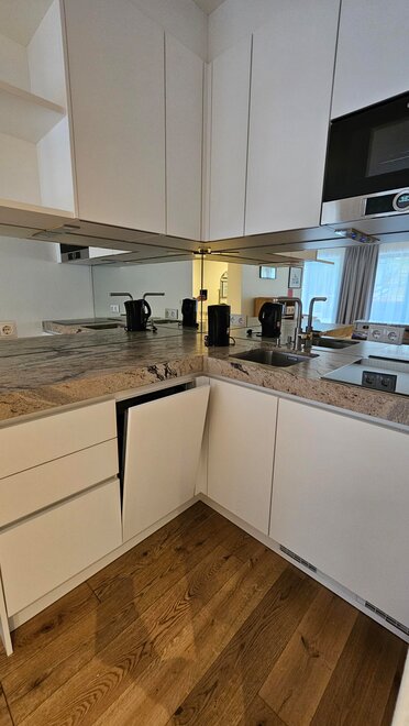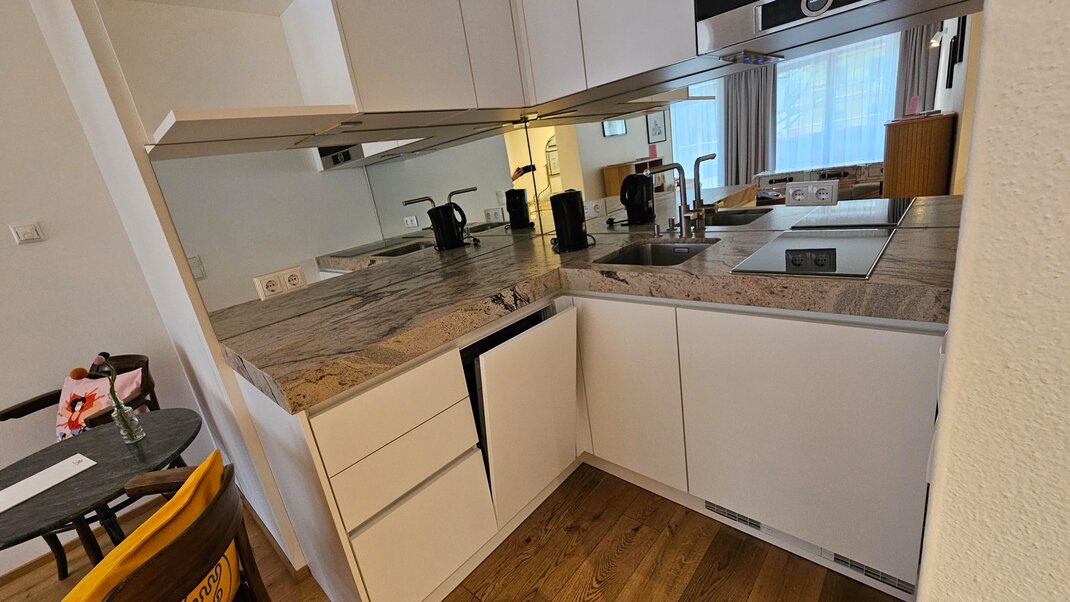 Here, you can wonderfully enjoy the sun. Our Blü Terrace Studio has its own fully equipped kitchenette with a dishwasher, cooktop, and microwave.