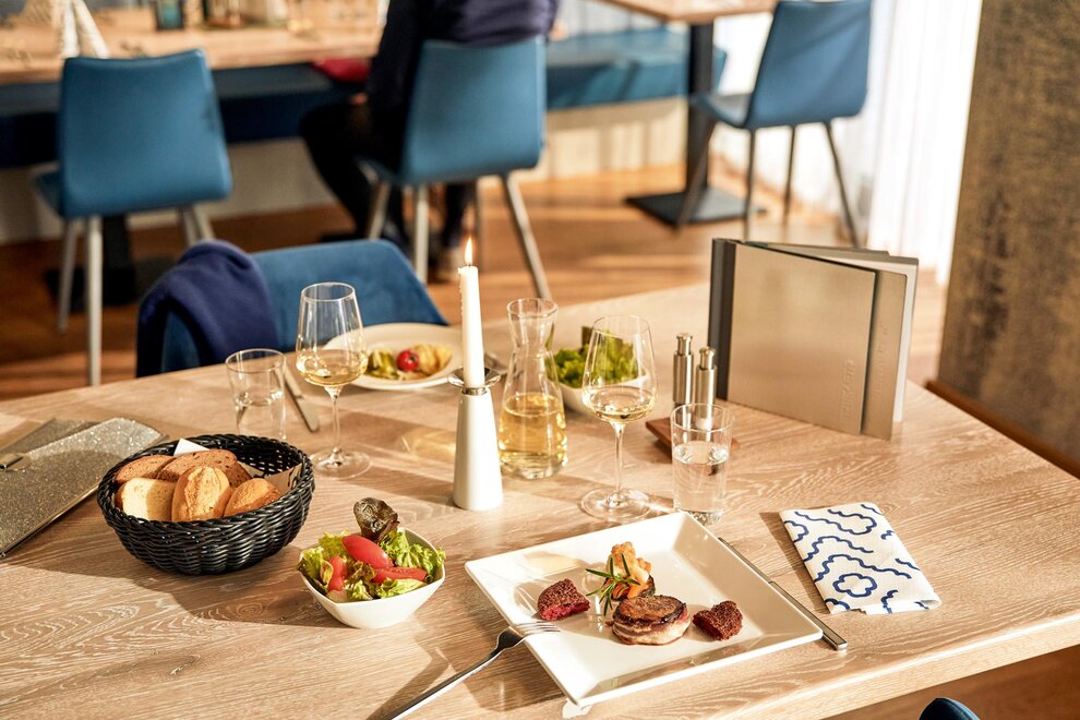 Geniet van een gevarieerd ontbijtbuffet met verfijnde koffie- en theespecialiteiten, een selectie van vleeswaren, kazen, jams, muesli en vers bereide fruitsalade – de perfecte start van de dag. Er is ook een uitgebreid aanbod van vegetarische en veganistische gerechten. Met halfpension wachten er 's avonds een afwisselend 5-gangen buffet op onze gasten, aangevuld met dagelijks wisselende vegetarische gerechten.