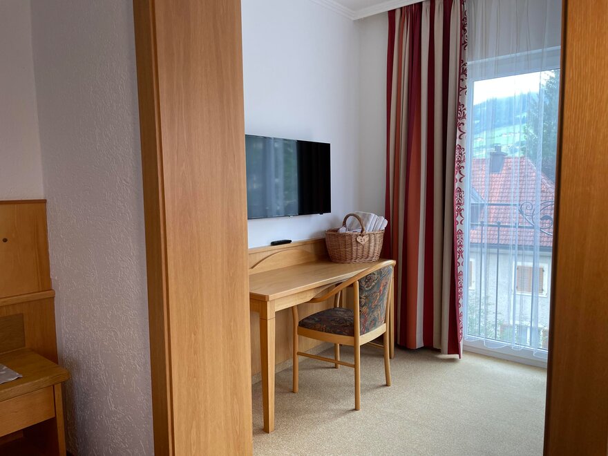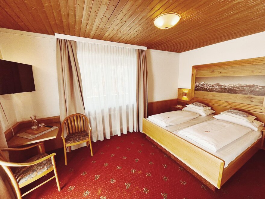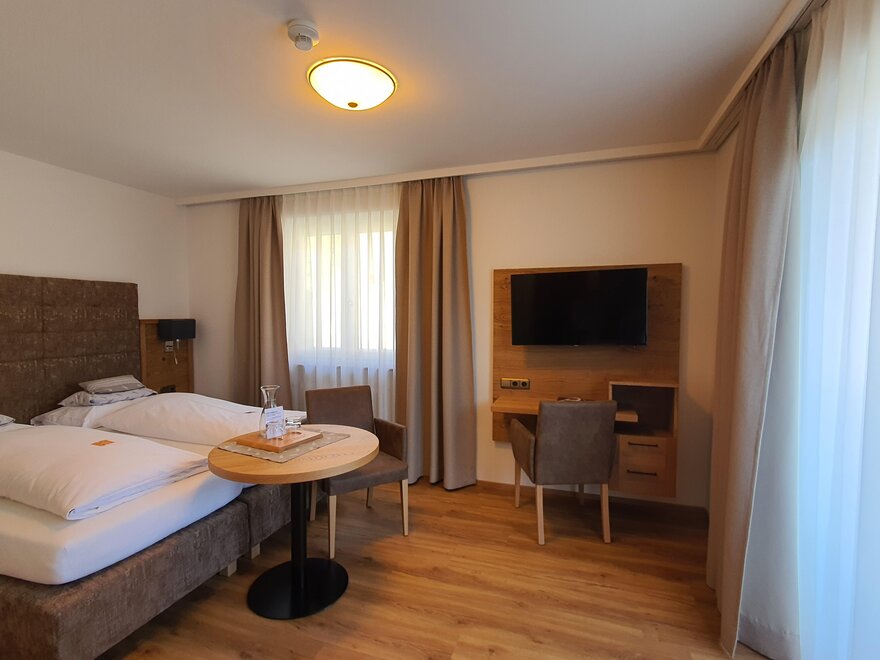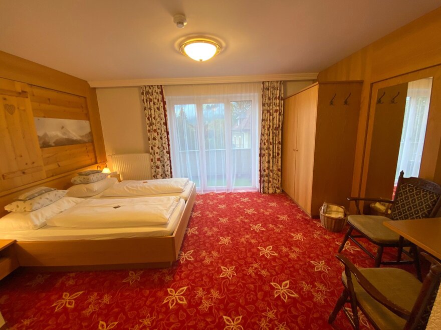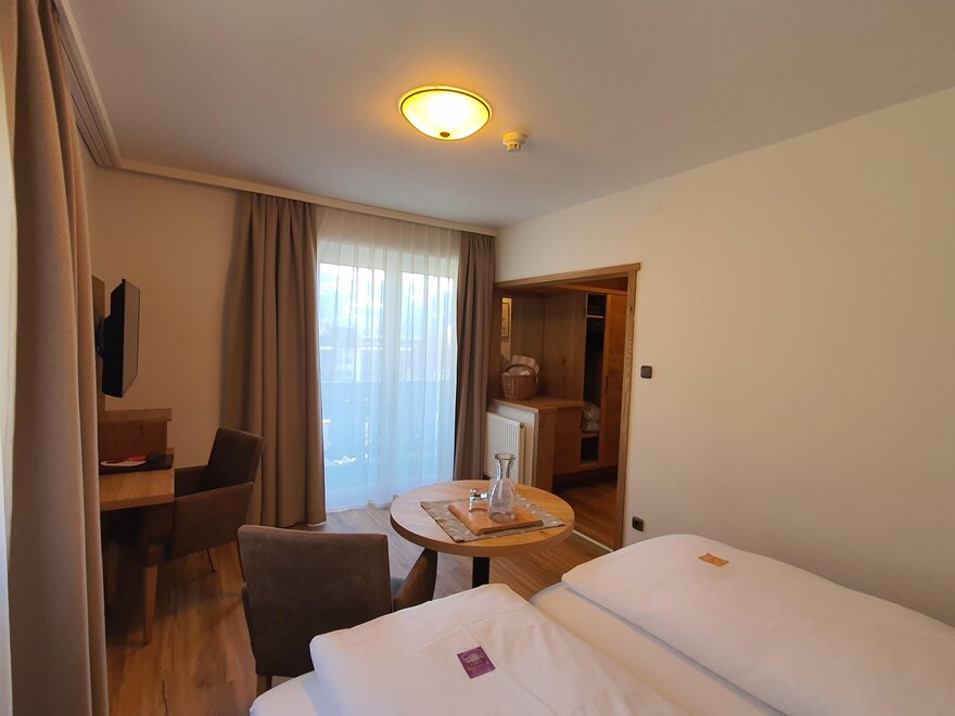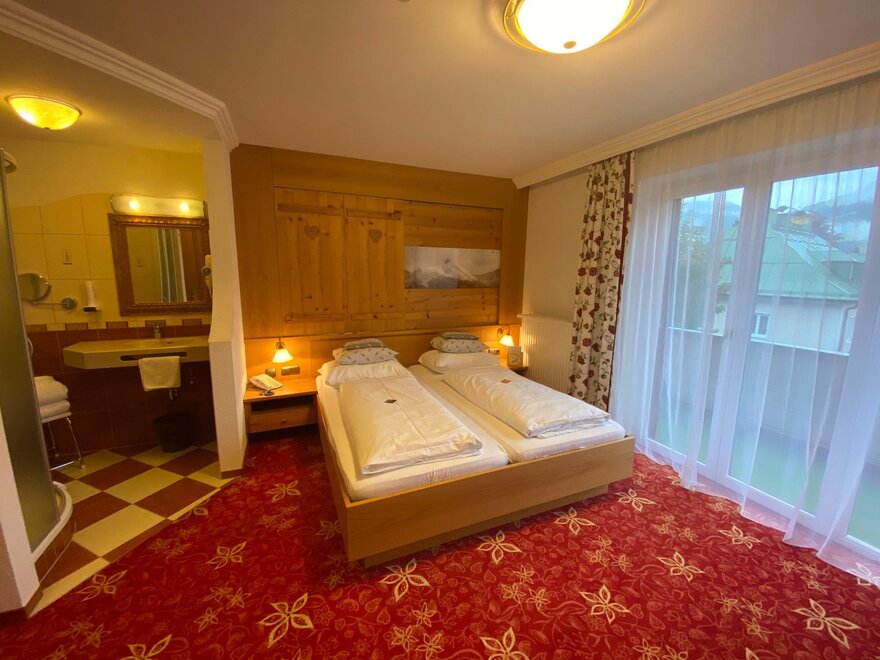 double room for 2 people with shower and WC, radio and TV with corner balcony and beautiful view of the Gastein mountains. Some of the rooms are furnished with a box-spring bed and wooden floor.
