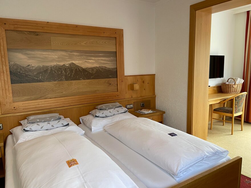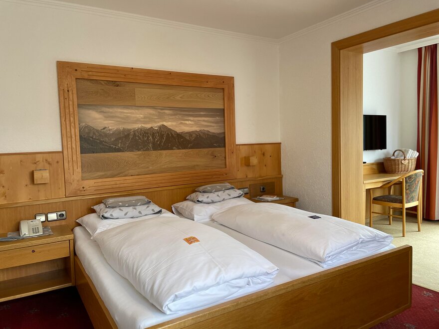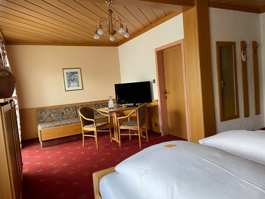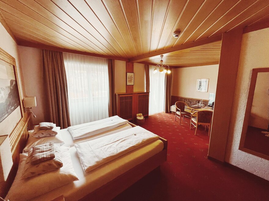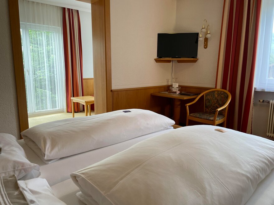 Nice Doubleroom for 2-3 person with bath or shower, toilet, radio and TV with a seating area, a balcony or a French balcony and nice mountain view.