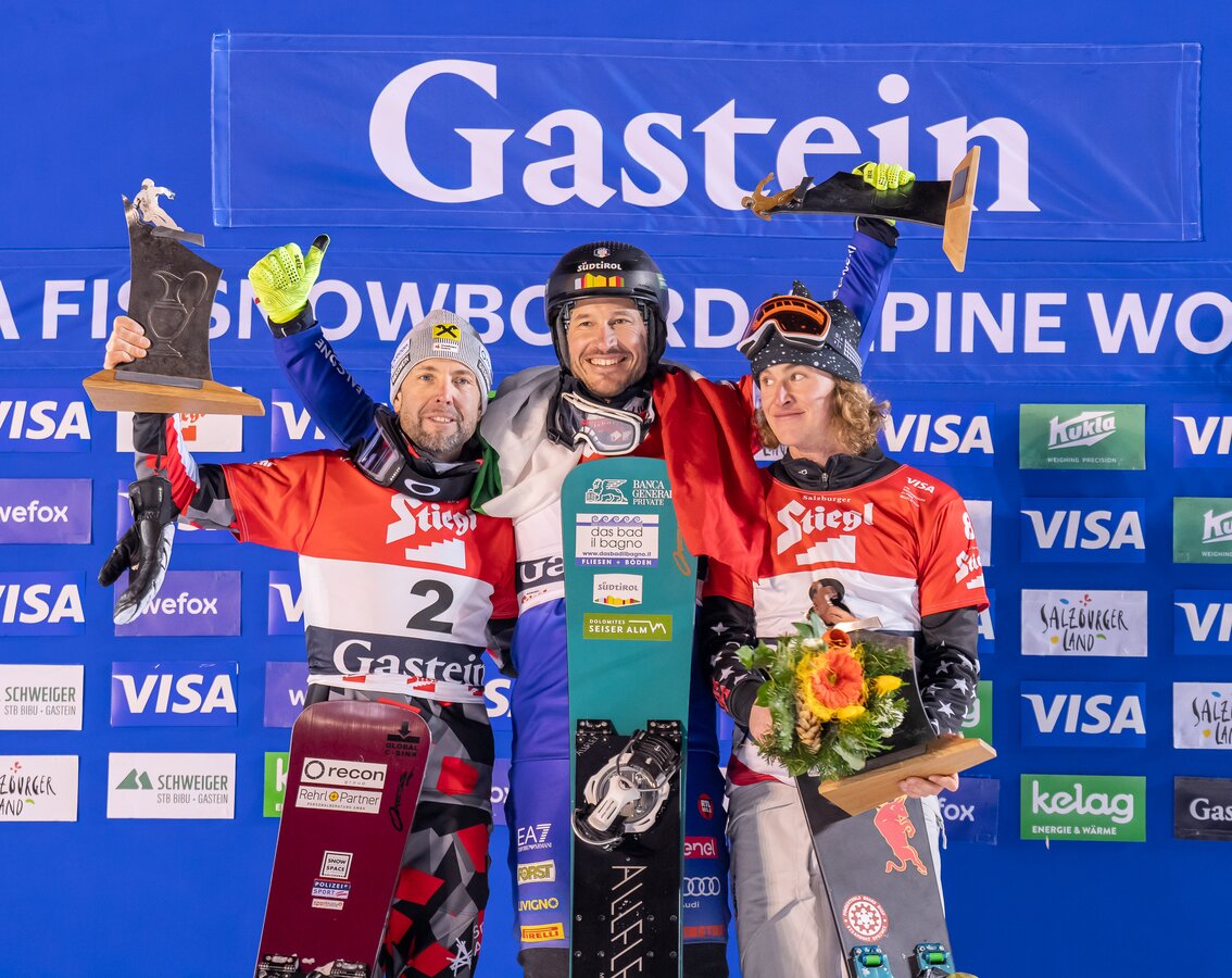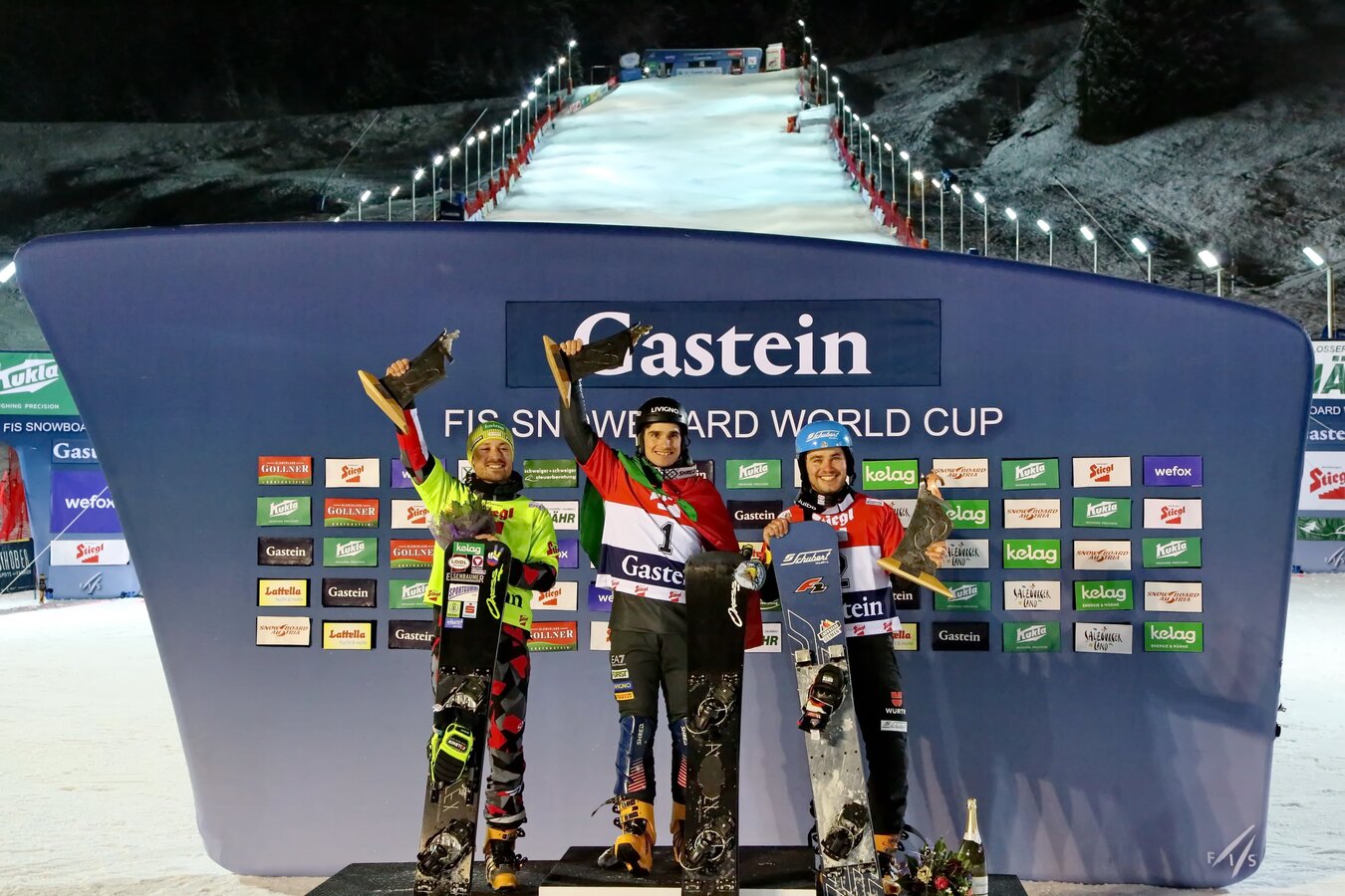 Drei Snowboarder jubeln auf dem Podest in Gastein, halten Pokale, Blumen und Snowboards hoch. | © KTVB Bad Gastein, Magotree Photography