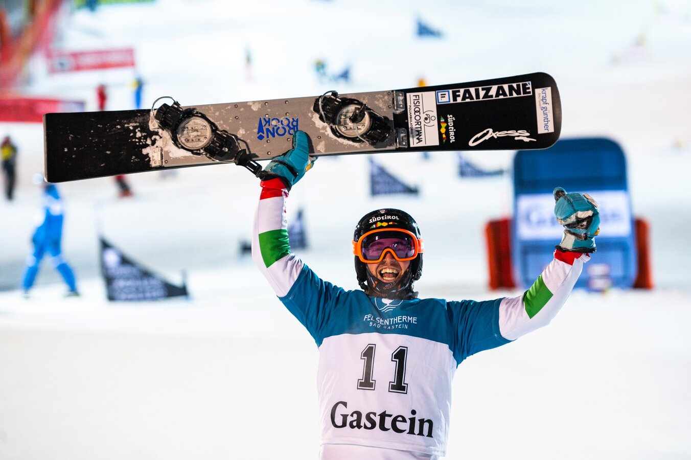 Snowboarder mit Startnummer 11 reißt jubelnd die Arme hoch und hält sein Brett über dem Kopf in Gastein. | © FIS, Miha Matavz