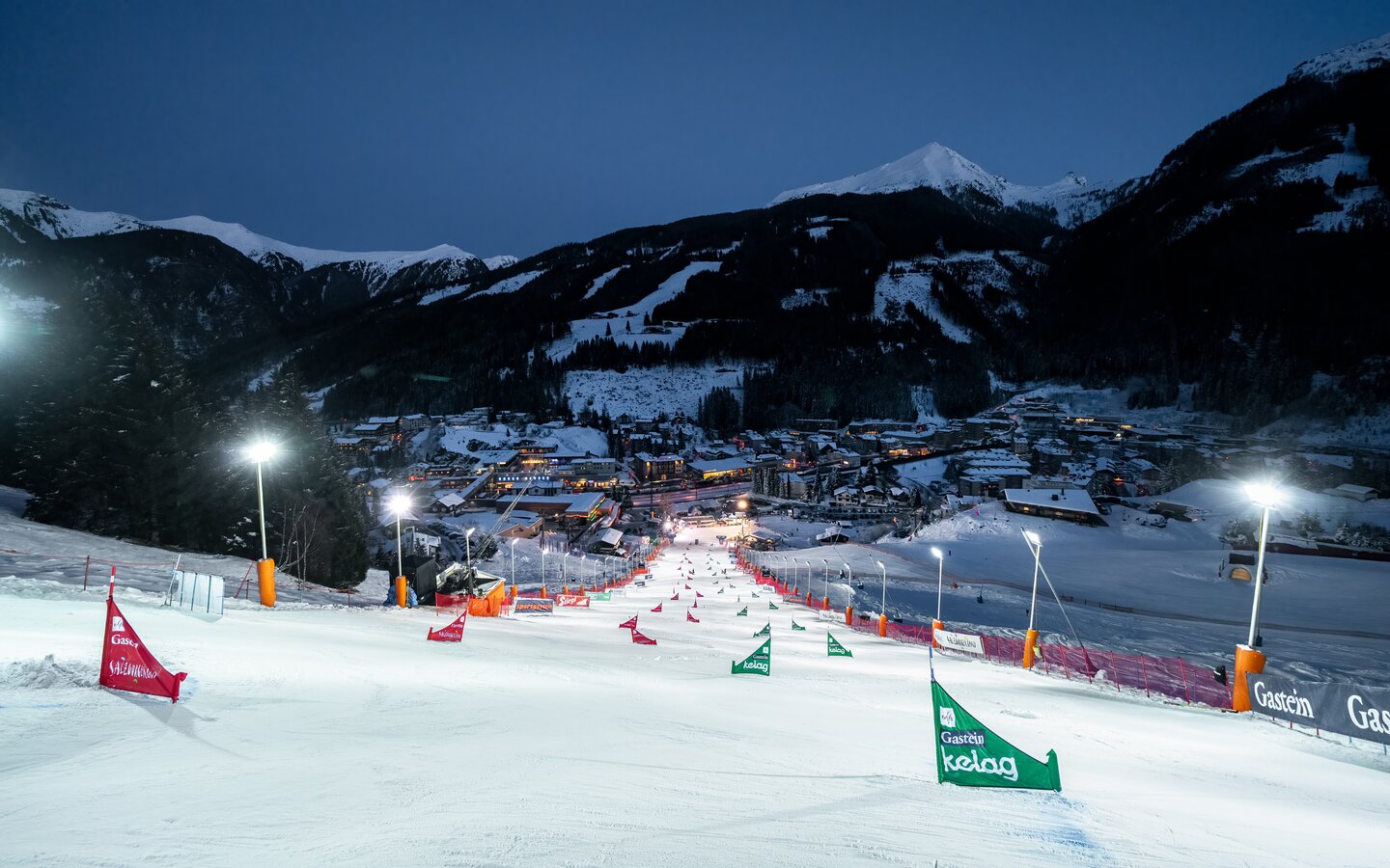 Beleuchtete Rennstrecke mit Slalomtoren führt hinab nach Bad Gastein im Abendlicht der Berge. | © KTVB Bad Gastein, Simon Hutter