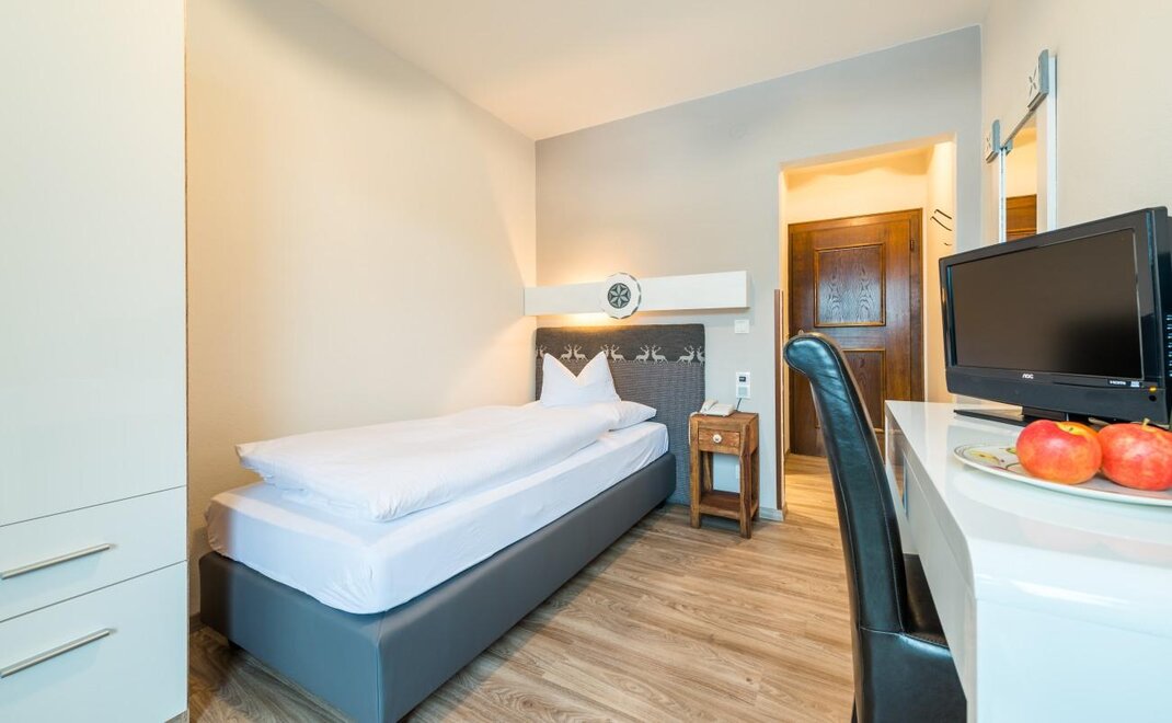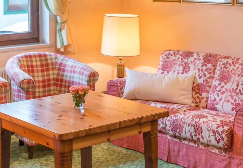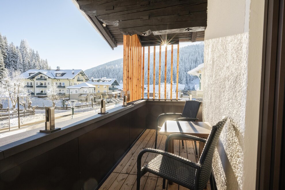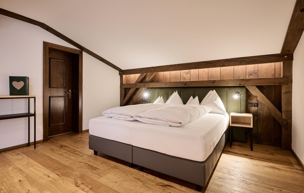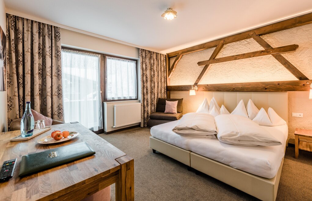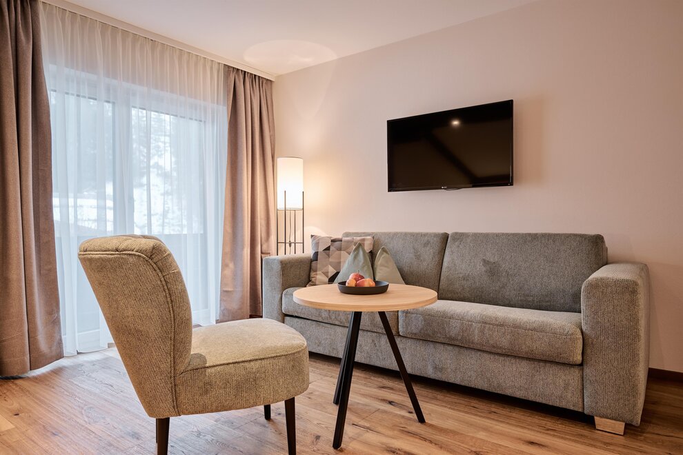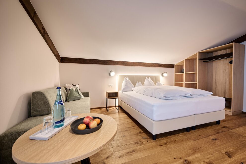 ROOM: spacious room with approx. 26 m², comfortable double bed, couch (possible sleeping space for a child), safe, free Wi-Fi in all areas, TV in HD quality, balcony, seating area, wooden floor