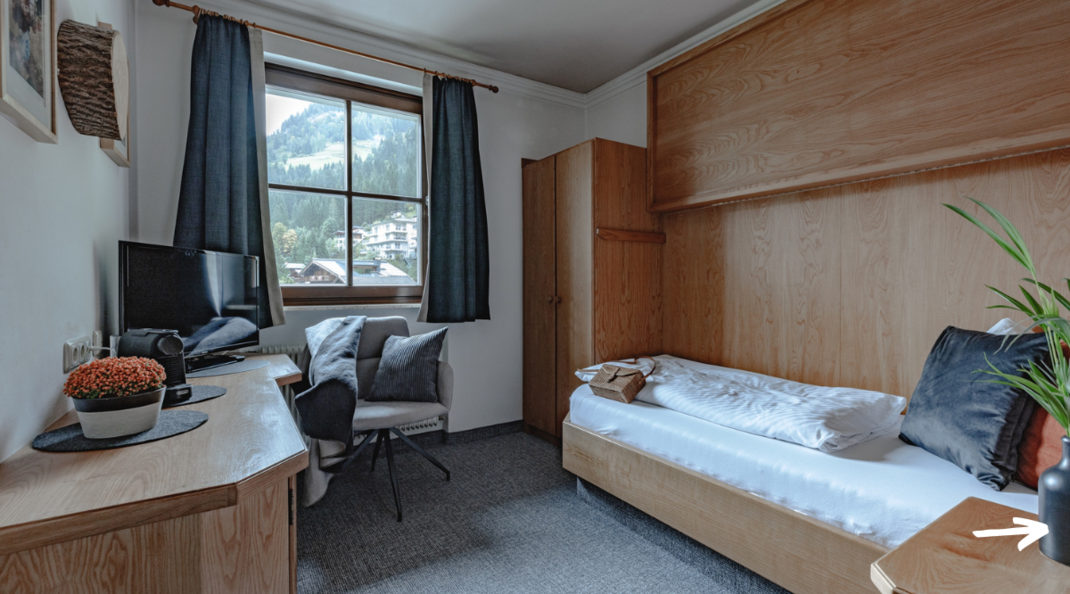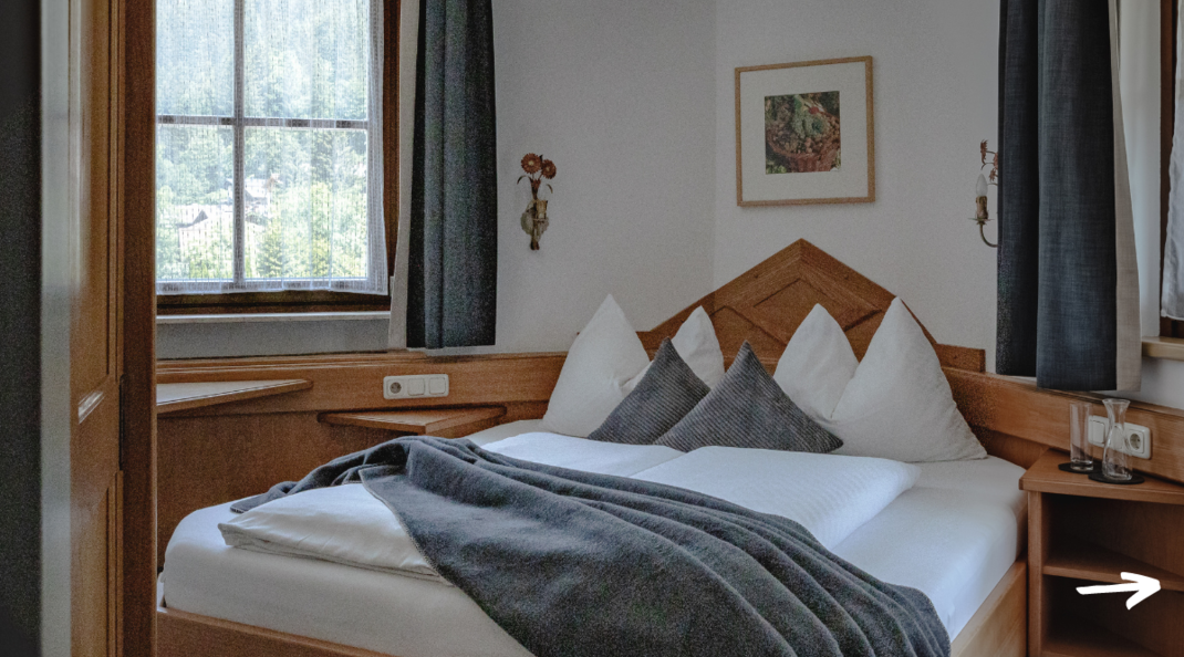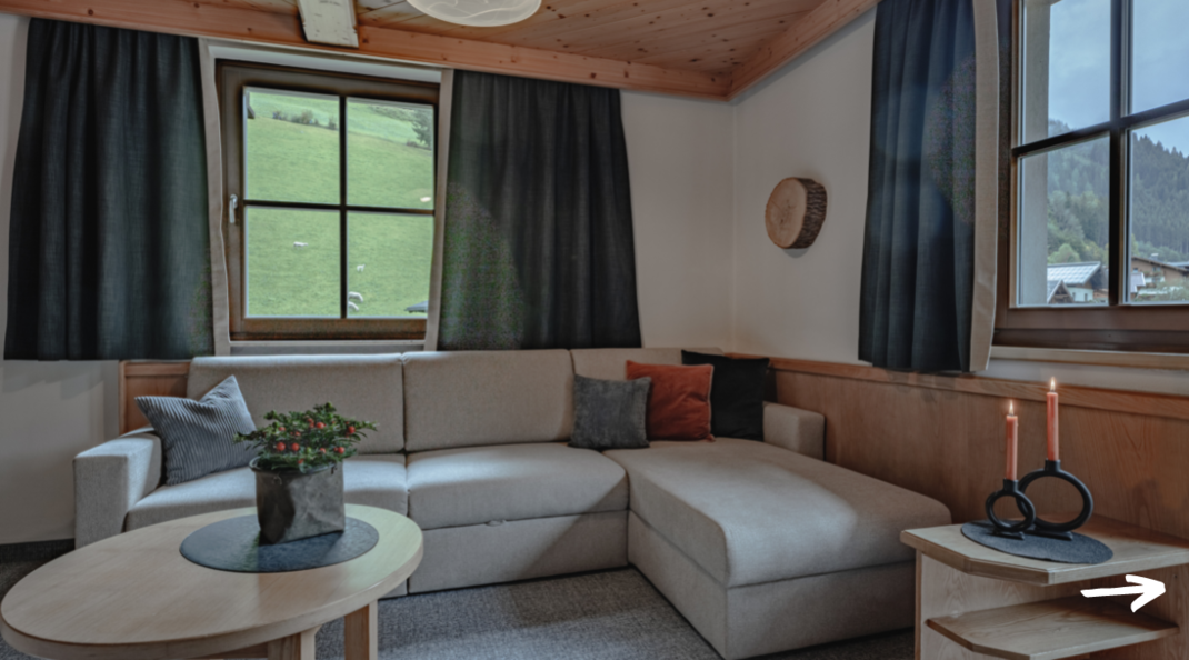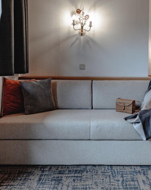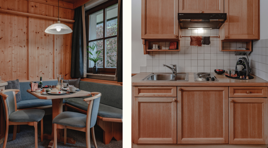 A sleeping room with a double bed, a living/sleeping room with a sofa bed, seating area, high-speed Wi-Fi, cable TV | Kitchenette: refrigerator with freezer, microwave, kettle, Nespresso coffee machine, 2 hot plates, sink, cooking and dining utensils, dish soap, salt and pepper set, sugar shaker | small bathroom with shower and toilet | west-facing balcony | Apartment Lärche for up to 3 persons, 28 m²