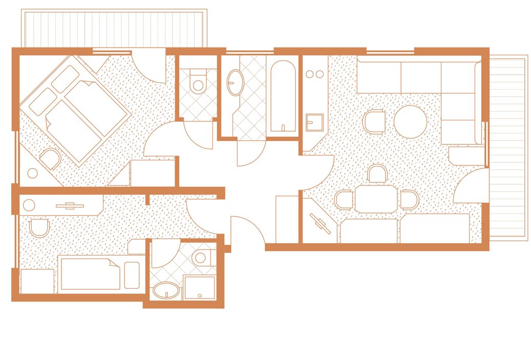 kuchenka elektryczna, ekspres do kawy, płaszcz kąpielowy na życzenie, telefon, wentylator, czajnik bezprzewodowy, pokój przechodni, pojemnik do zamrażania, telewizja kablowa, balkon, oddzielna sypialnia: 1, pościel dla alergików, taras w wybranych pokojach, akcesoria toaletowe, szafa, automatyczne budzenie, salonik, salon/sypialnia oddzielone, możliwość przygotowywania posiłków, WiFi, lodówka, meble balkonowe, suszarka do włosów, pokój dla niepalących, sejf