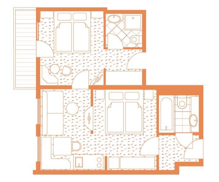 A children's room with a bunk bed and a single bed | a living area with a double bed, seating area, high-speed Wi-Fi, cable TV | kitchenette: refrigerator with freezer, microwave, kettle, Nespresso coffee machine, 2 hot plates, sink, cooking and eating utensils, dish soap, salt and pepper set, sugar shaker | bathroom with shower and toilet | east-facing balcony | Apartment Chestnut for up to 5 people, 34 m²