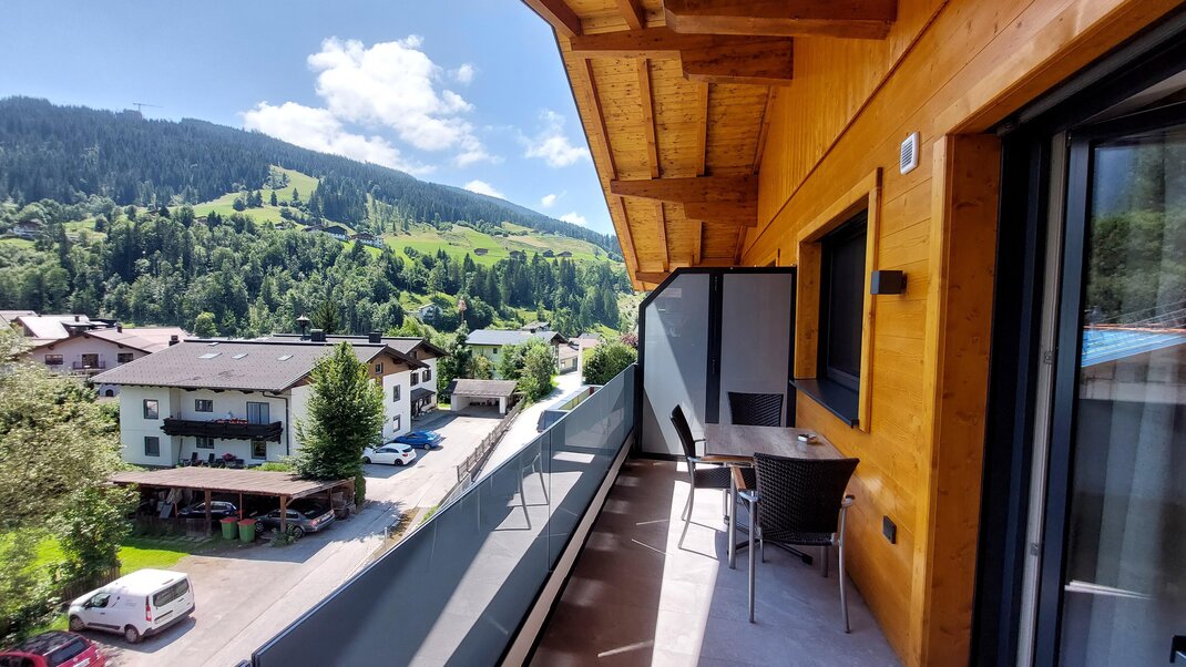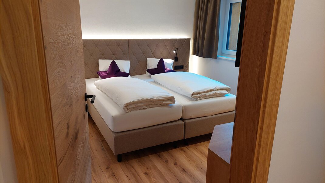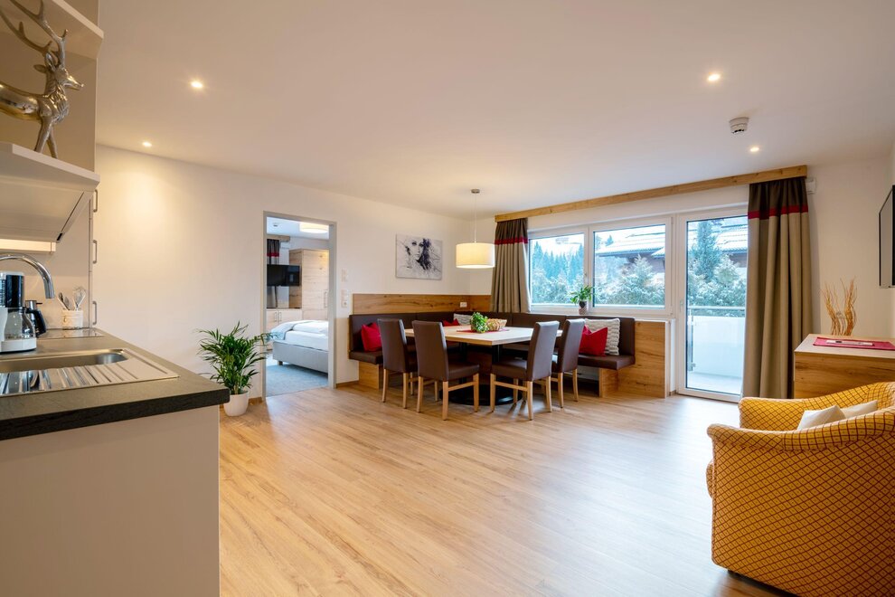 The classic apartement E1 is 60 m² large and is equipped with a modern kitchen, 2 bedrooms, combined kitchen-living room, bathroom and shower, separate WC, cable TV, wifi internet access and a large, southsided panorama balcony.
