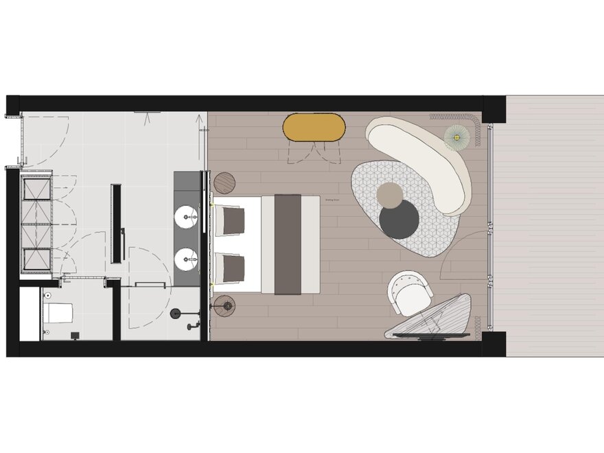 wooden floor, box-spring bed, comfortable writing and sitting area (with double pull-out sofa bed in the living area), bathroom with shower, separate WC, spacious south-facing loggia – partly with garden access, minibar, vegan care products
