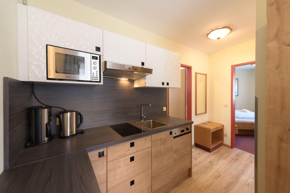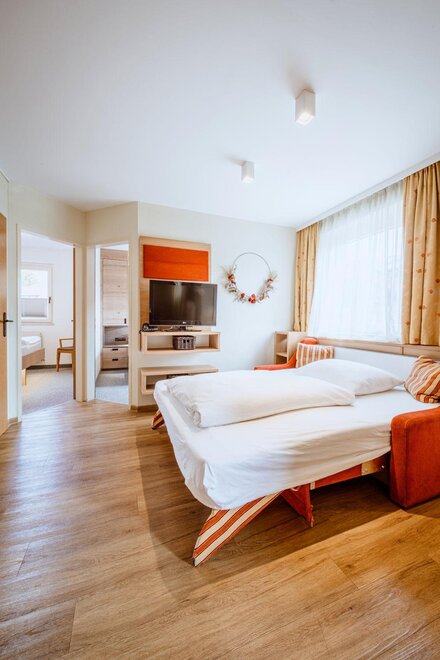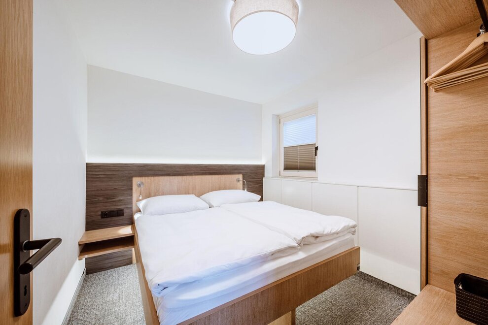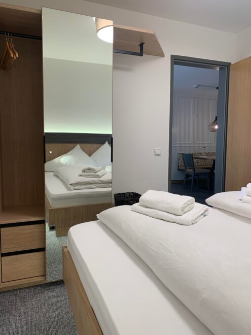 Space for up to 6 people. Two-room apartment with an entrance area including a kitchenette, shower, WC, living/sleeping area with a double bed and a couch, one bedroom with a double bed, balcony, safe, hairdryer, 2x cable TV, telephone.