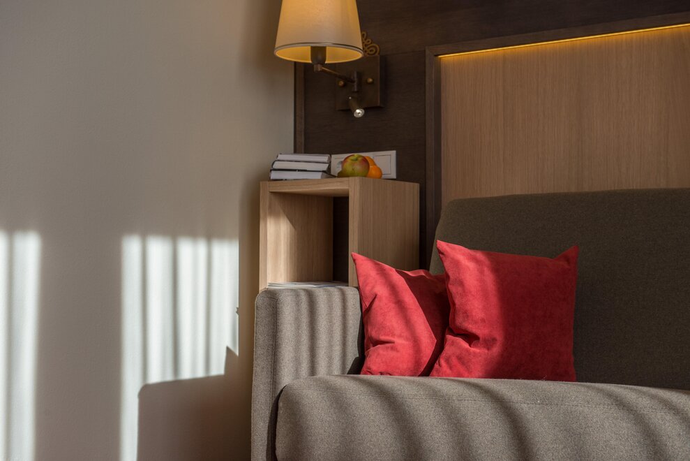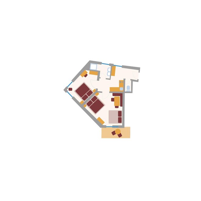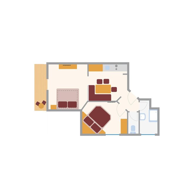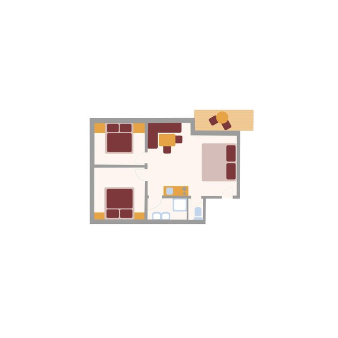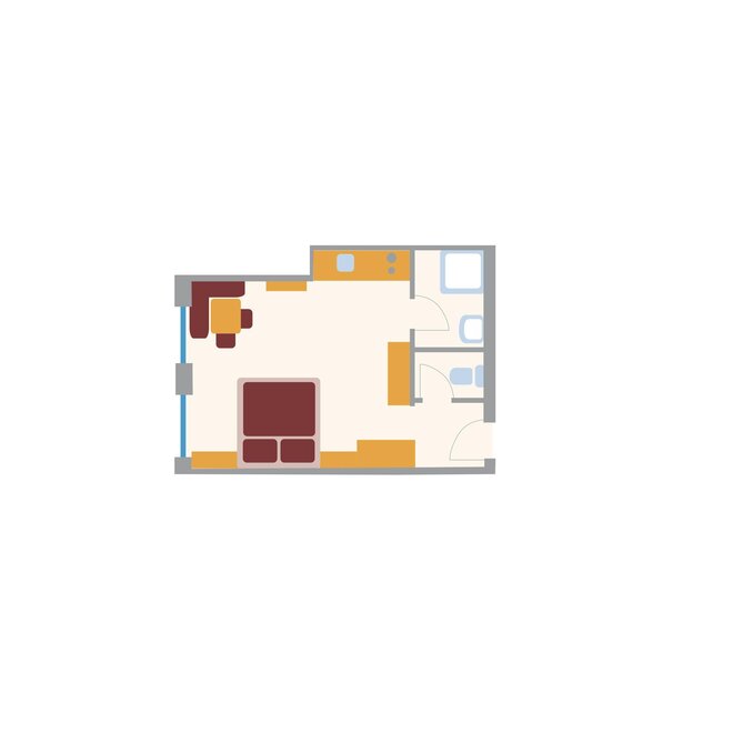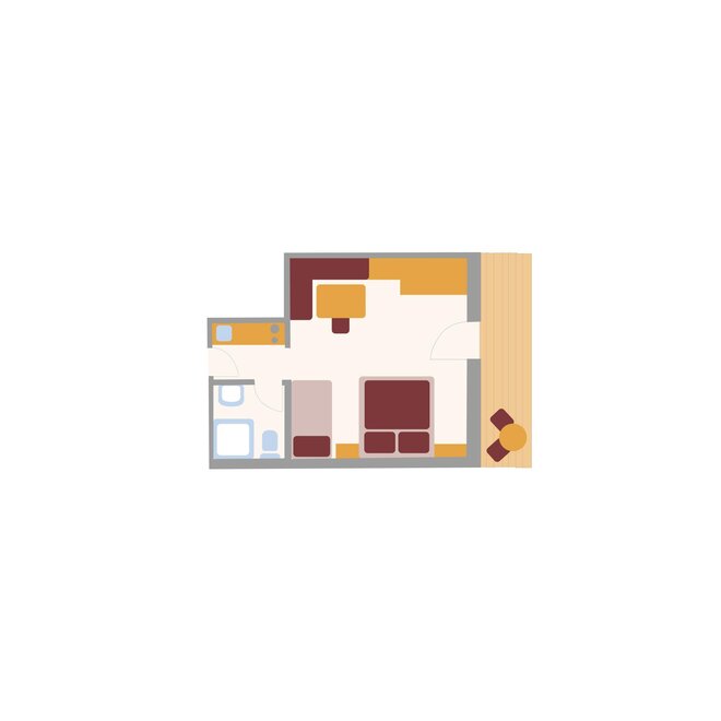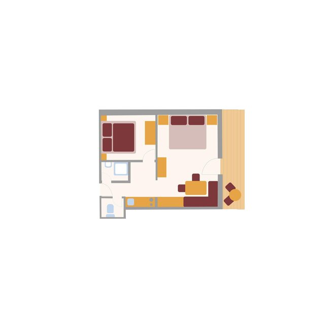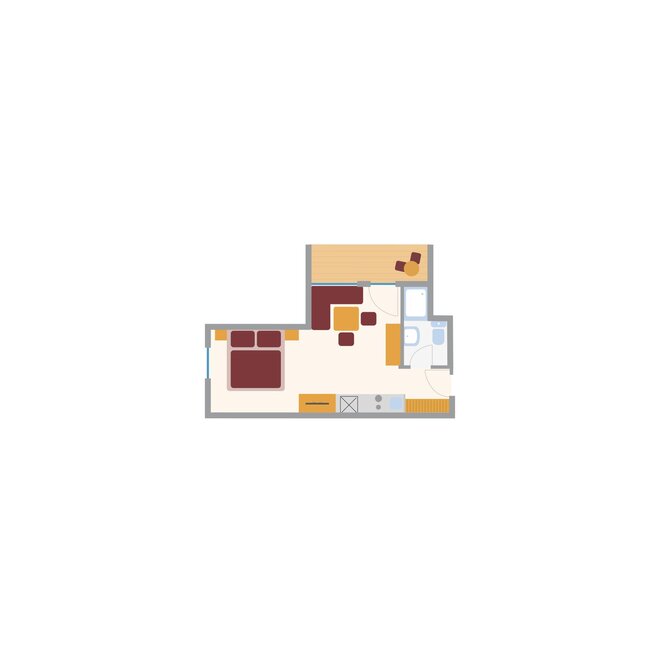For up to 2 persons. One-room apartment with a small entrance area, living/sleeping area with double bed, kitchenette, shower/WC, balcony, safe, hairdryer, cable TV, radio, and telephone. Can be booked with a connecting door to Duett.