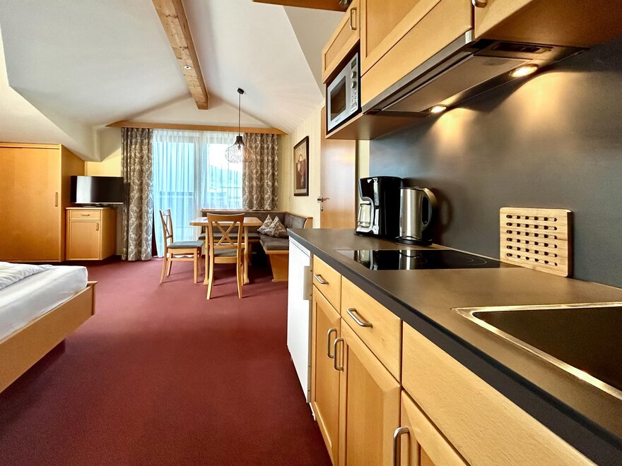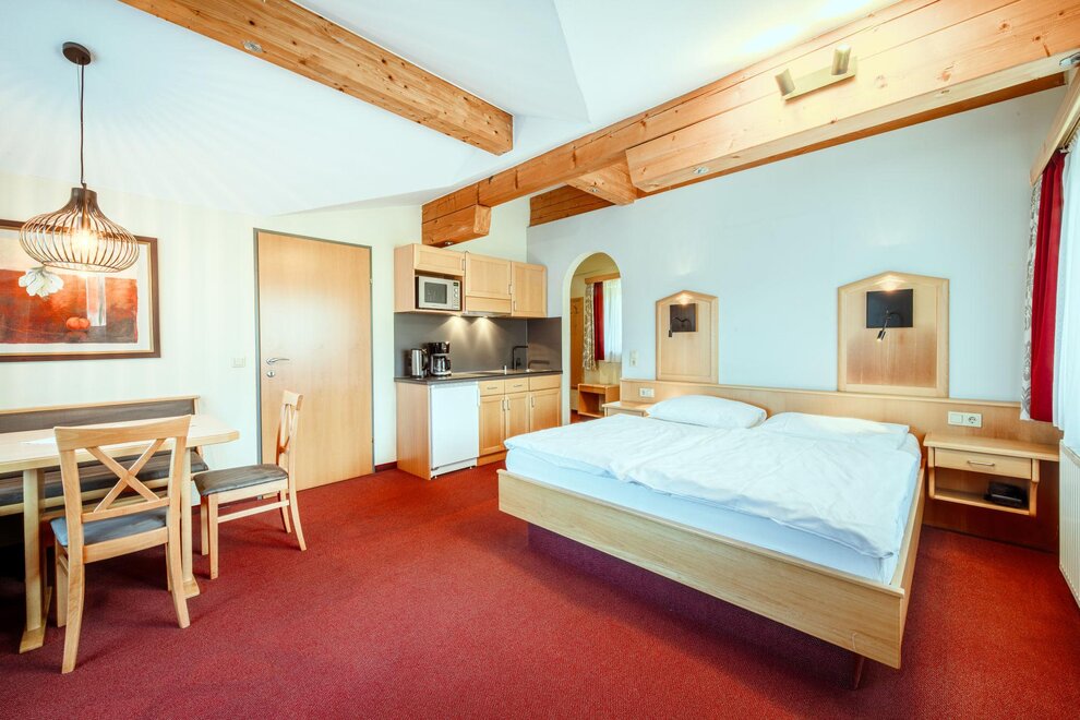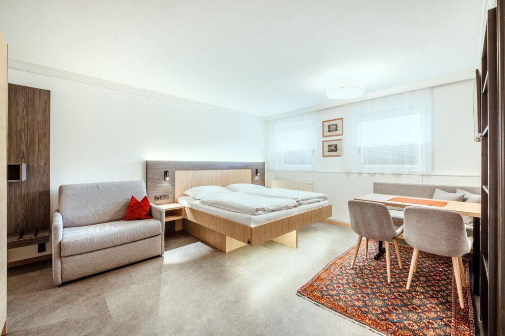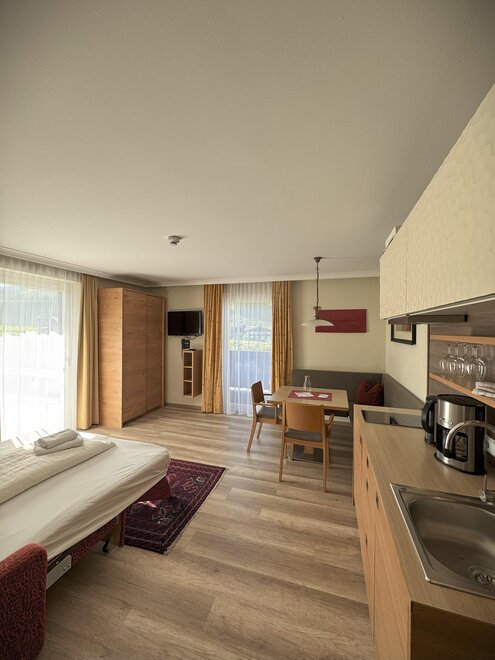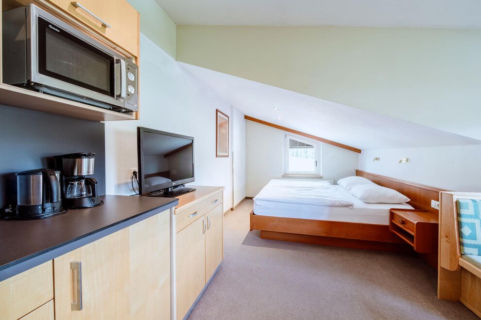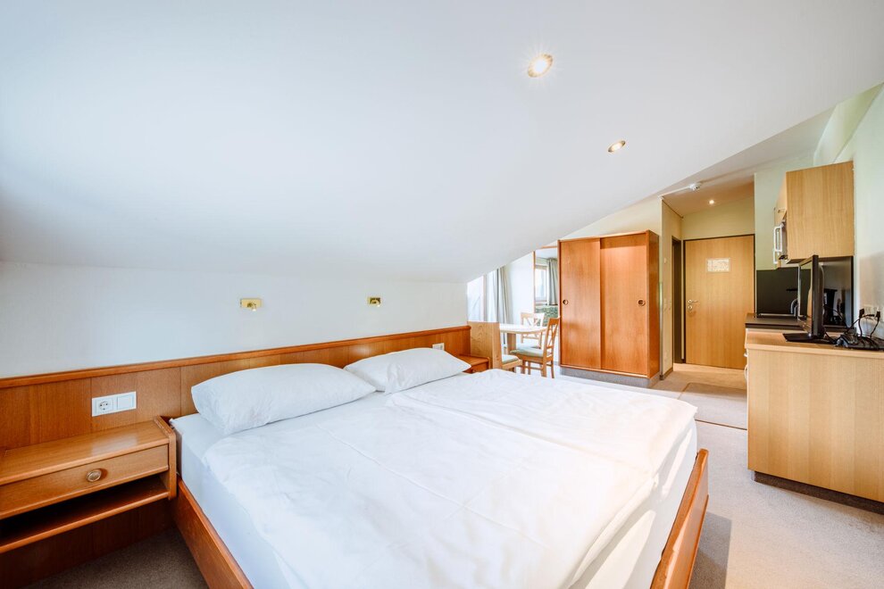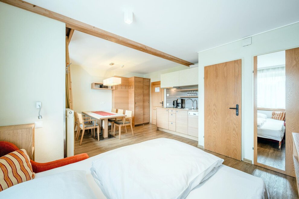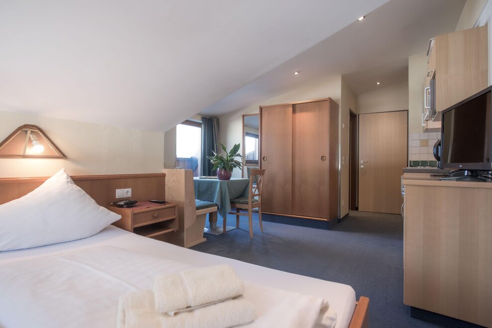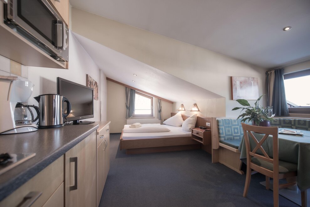 Wohnen bis 2 Personen. Einzimmerappartement, Wohn-/Schlafraum mit Doppelbett, Ferienkochnische, Eckbank, Dusche/WC, Balkon, Safe, Fön, Kabel-TV, Radio und Telefon. Mit Verbindungstüre zu Quartett Mansarfe buchbar.