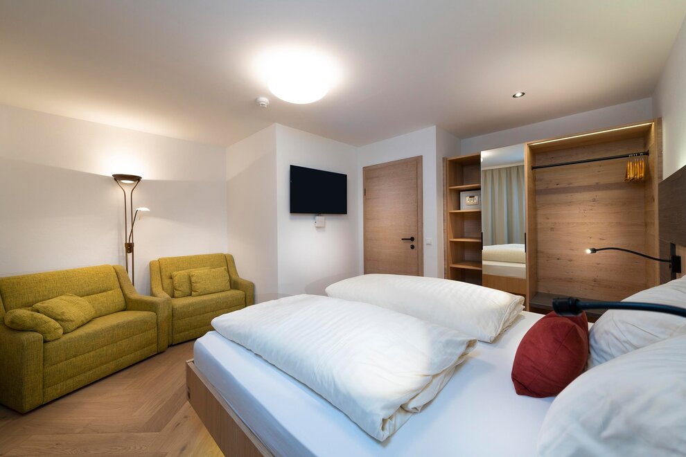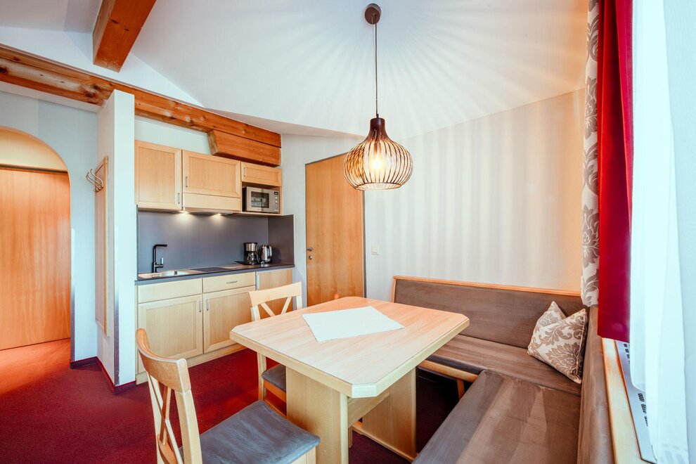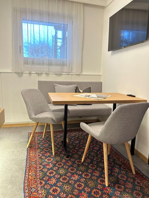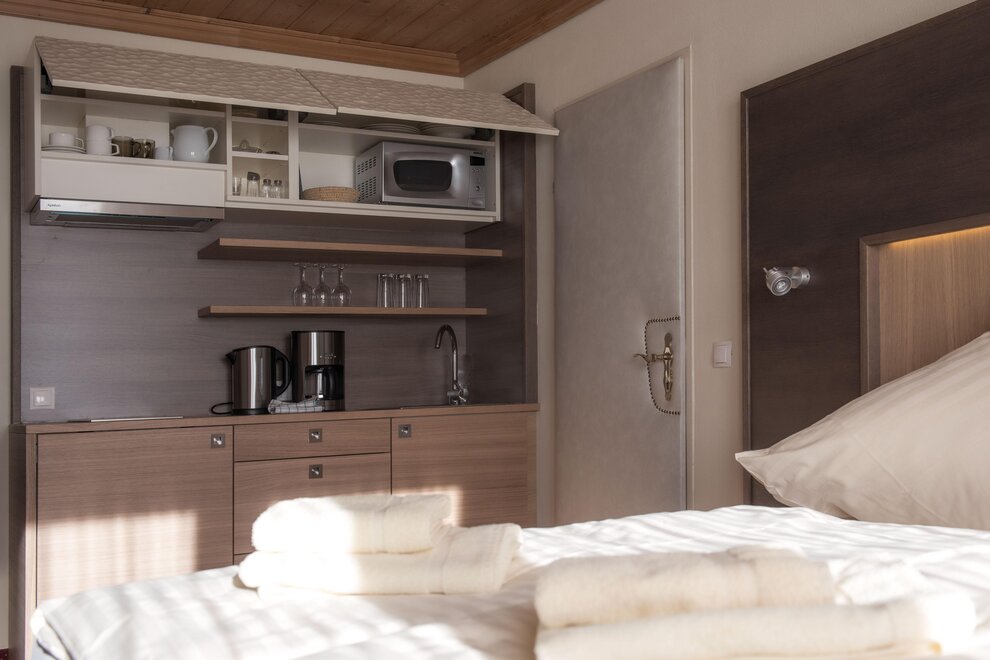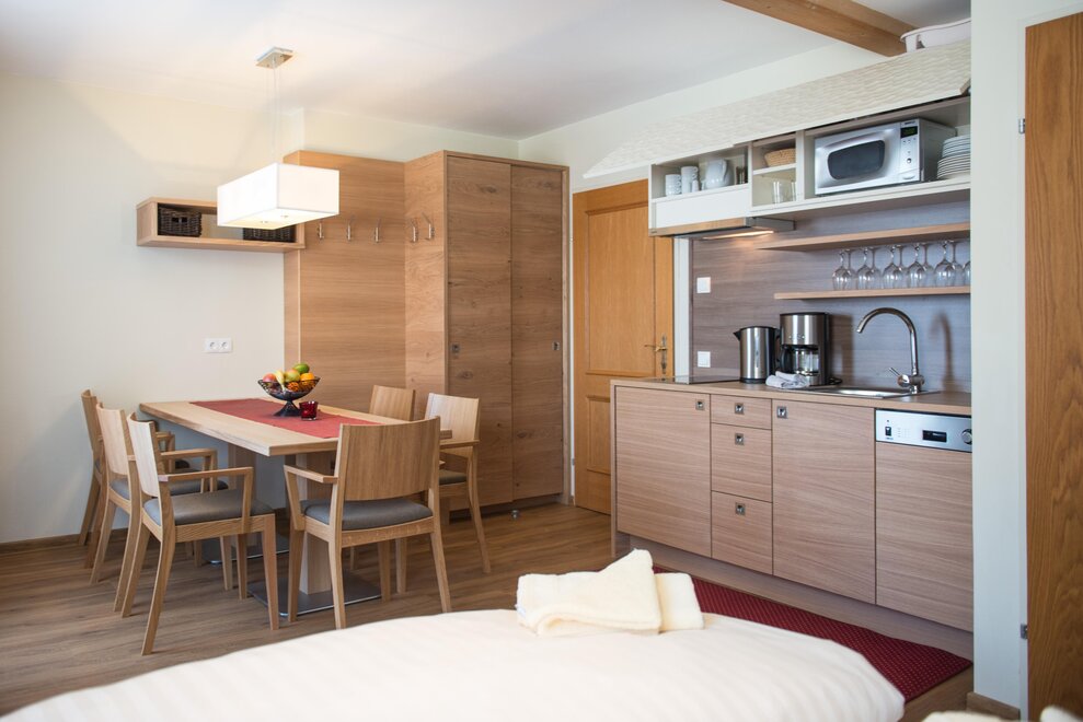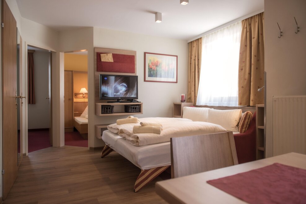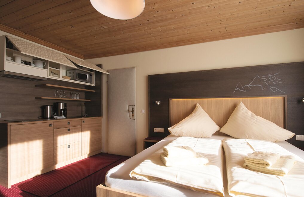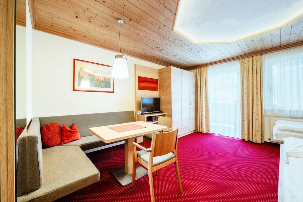 Wohnen bis 2 Personen. Einzimmerappartement, Wohn-/Schlafraum mit Doppelbett, Ferienkochnische, Eckbank, Dusche/WC, Balkon, Safe, Fön, Kabel-TV, Radio und Telefon. Mit Verbindungstüre zu Quartett Mansarfe buchbar.