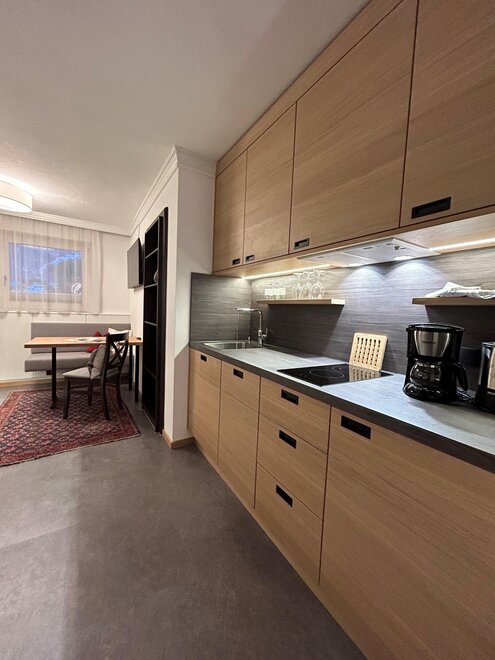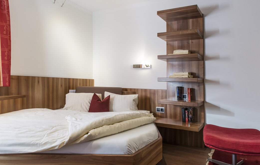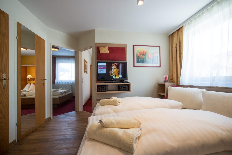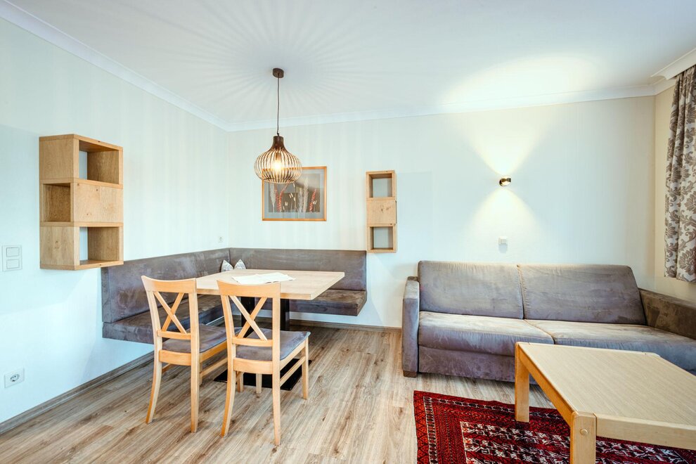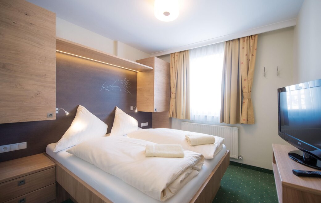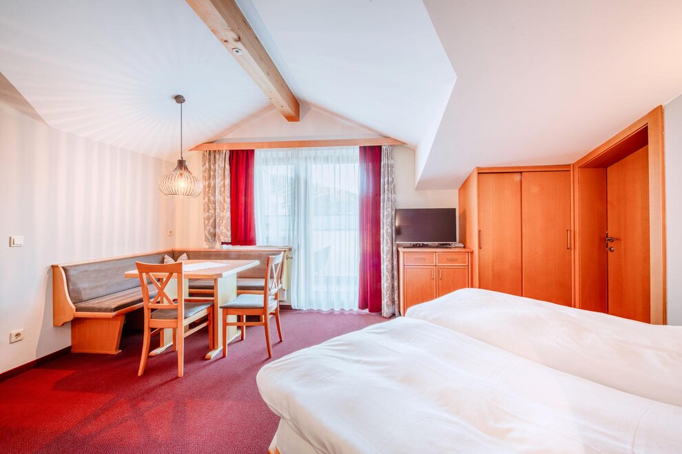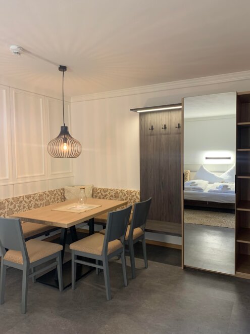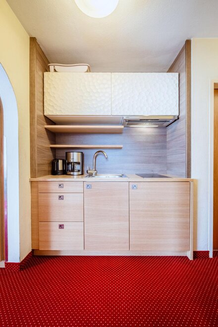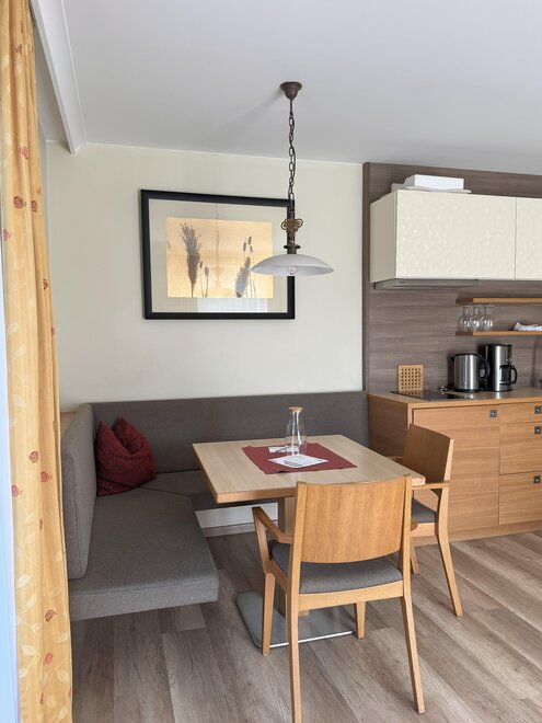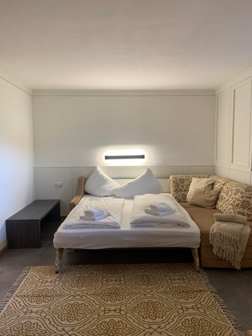 Wohnen bis 2 Personen. Einzimmerappartement, Wohn-/Schlafraum mit Doppelbett, Ferienkochnische, Eckbank, Dusche/WC, Balkon, Safe, Fön, Kabel-TV, Radio und Telefon. Mit Verbindungstüre zu Quartett Mansarfe buchbar.