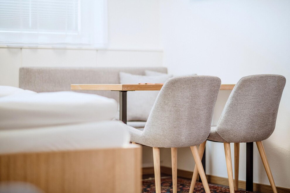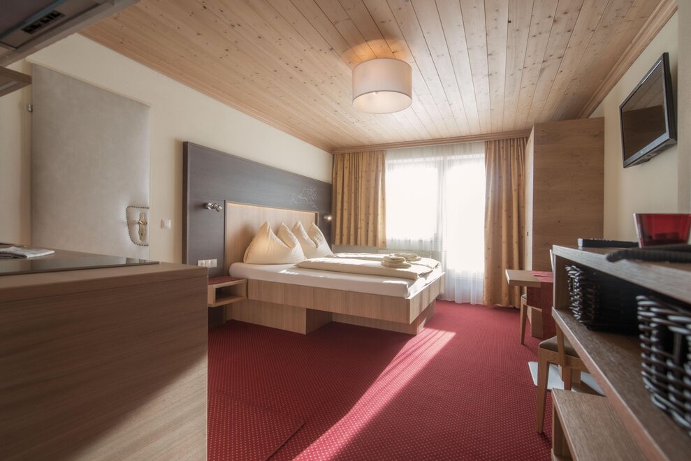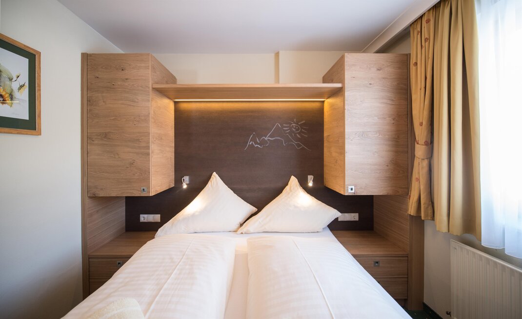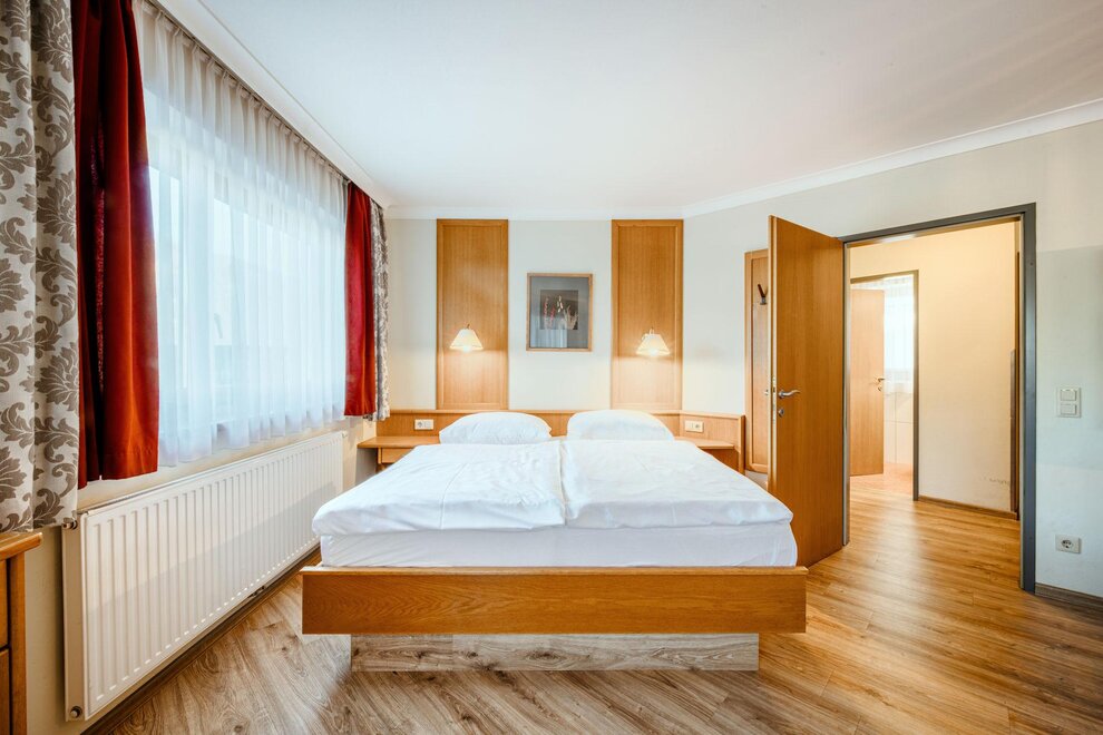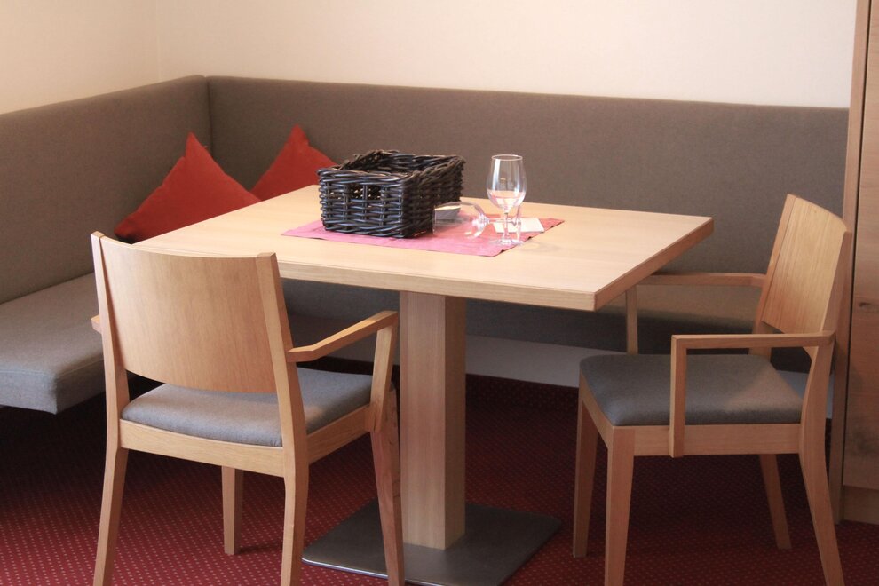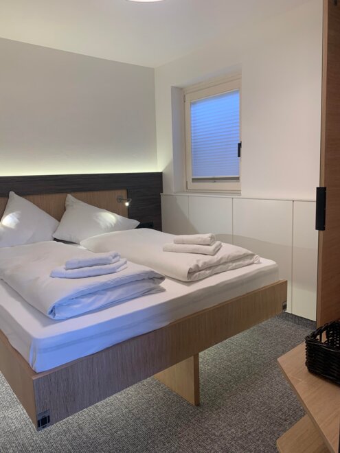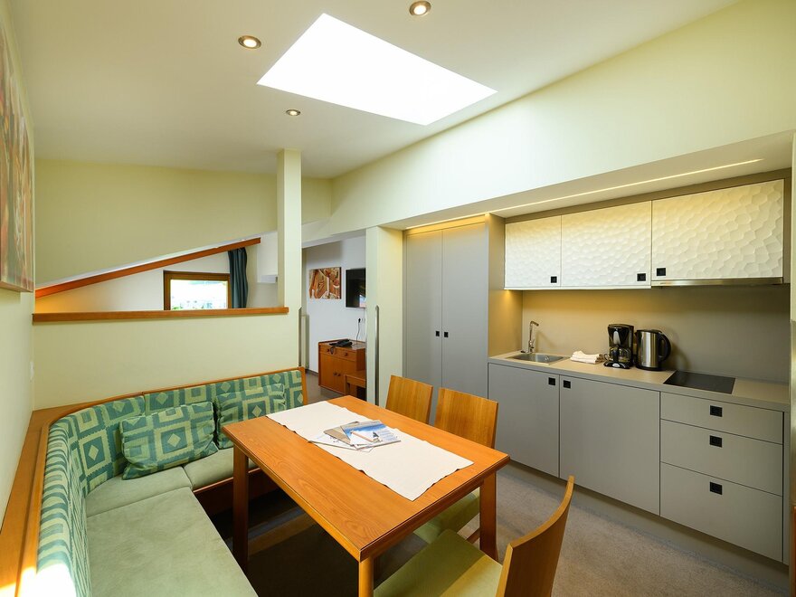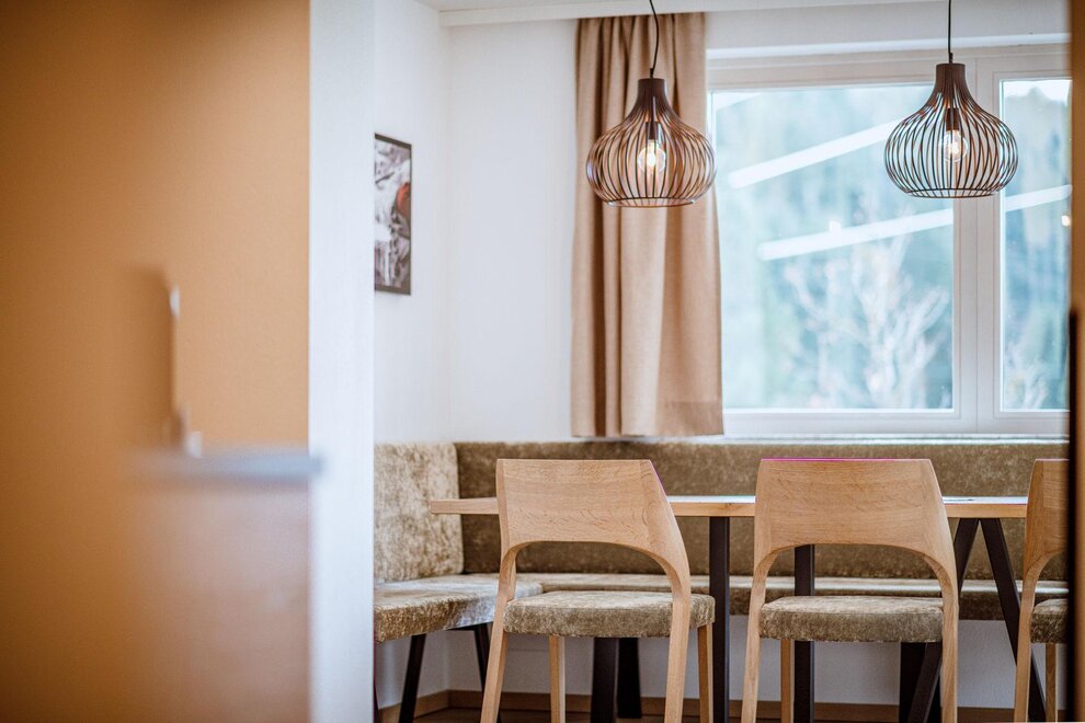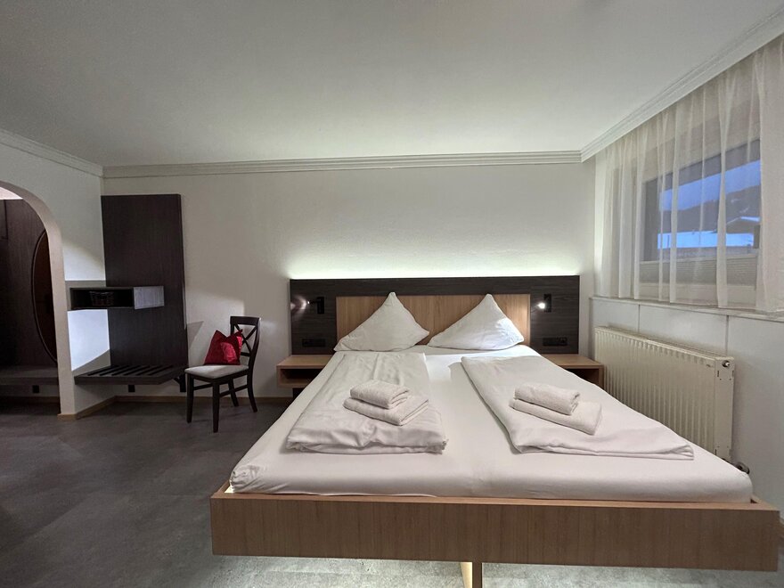 Wohnen bis 2 Personen. Einzimmerappartement, Wohn-/Schlafraum mit Doppelbett, Ferienkochnische, Eckbank, Dusche/WC, Balkon, Safe, Fön, Kabel-TV, Radio und Telefon. Mit Verbindungstüre zu Quartett Mansarfe buchbar.