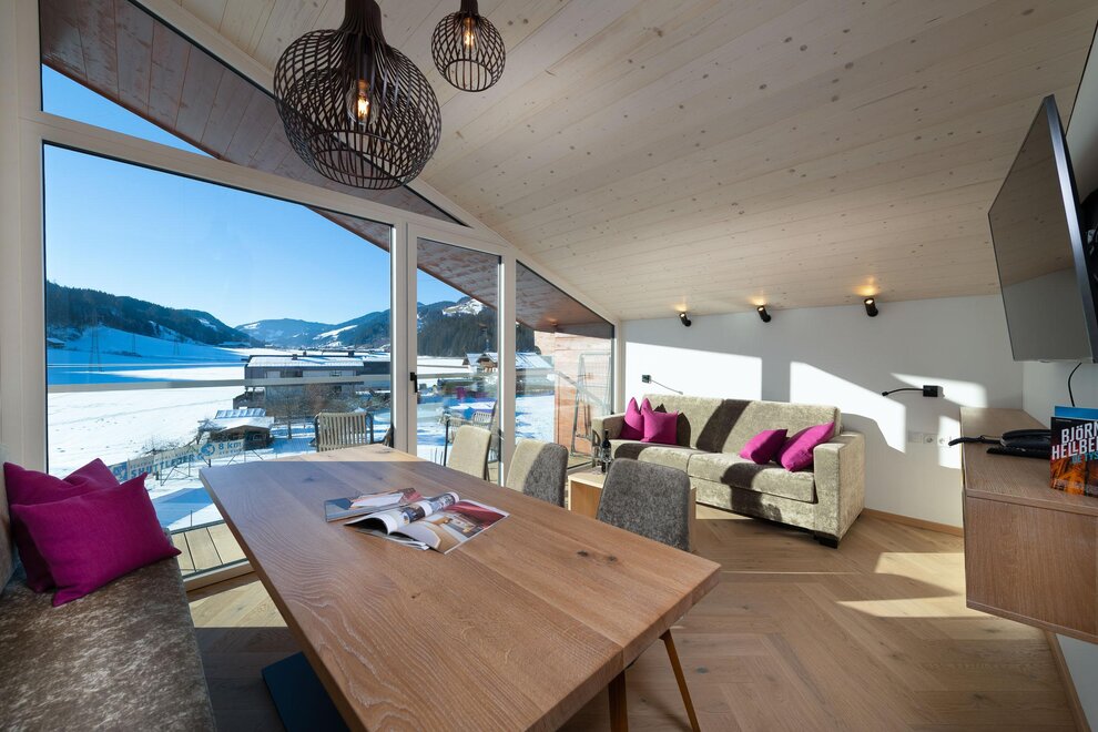 Fine, brand new 70 m² for 4 to 6 people, with 2 bedrooms with double beds, cable TV, and a bathroom with WC in each room, kitchenette, living & dining area with a double sofa bed, large flat-screen TV, panoramic windows, and a large dining table.