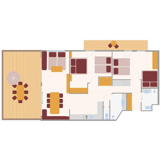 "110 m² for 4 to 8 people. 2 large bedrooms, each with 1 double bed and 2 single sofa beds, 2 bathrooms, 2 x WC, kitchen with extensive equipment, large living room with dining table, sofa, private access to the exclusive and furnished sun terrace.