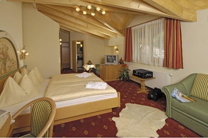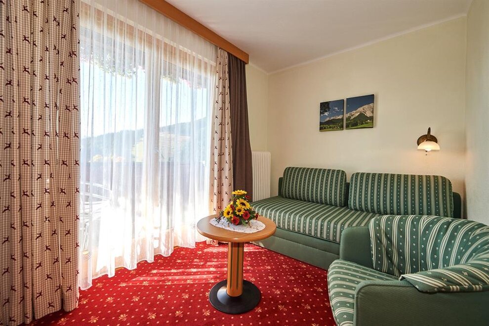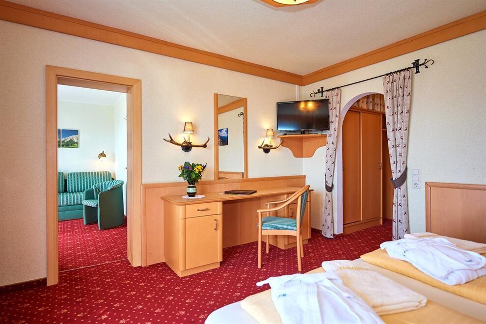z dużym balkonem (widok na Tauern / Hochkönig) w tym łazienka/prysznic, WC, kanapa, biurko, telefon, telewizja satelitarna, Wi-Fi, sejf, suszarka, szlafrokiWyposażenie pokoju