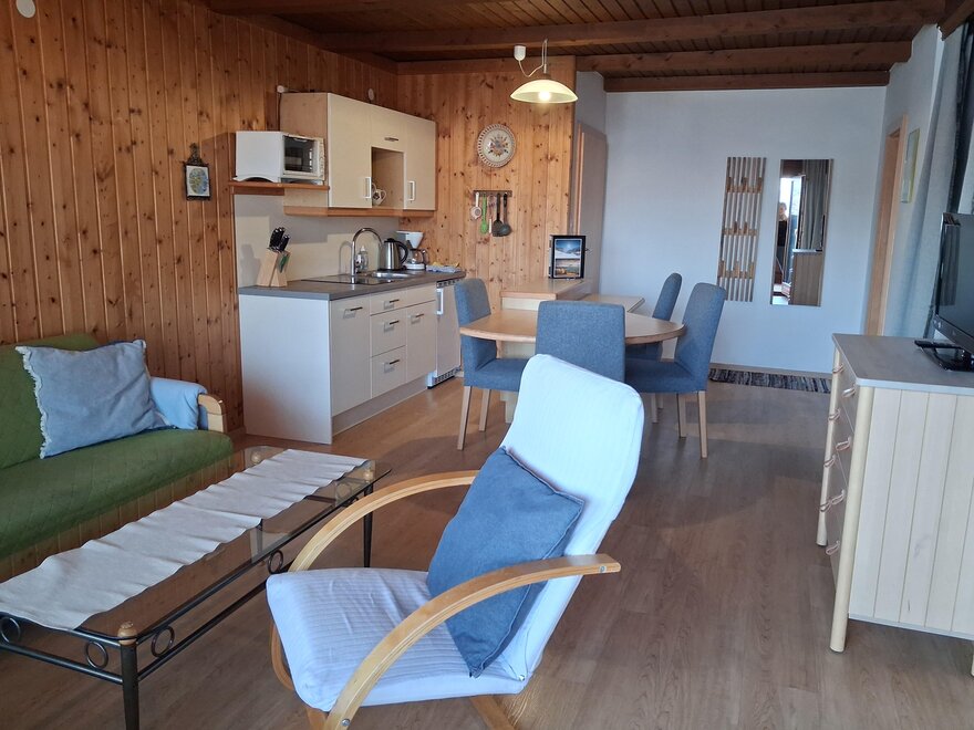 Apartment with kitchen/diner and seating area, 2 separate bedrooms, completely equipped kitchen, bathroom with shower/toilet, cable-TV, balcony, completely equipped with linen, coffee machine, oven