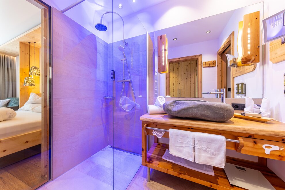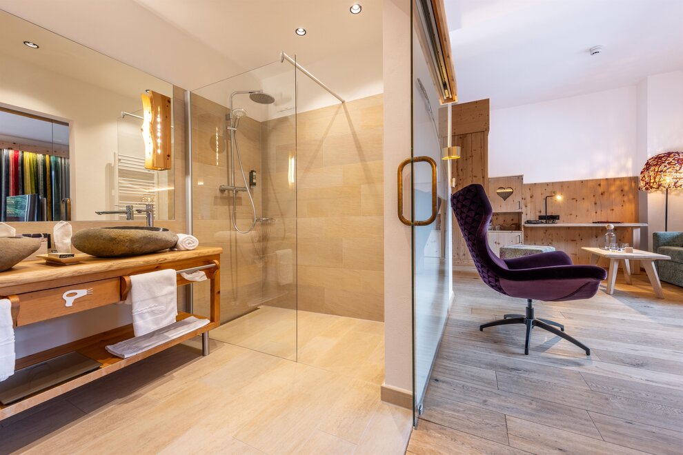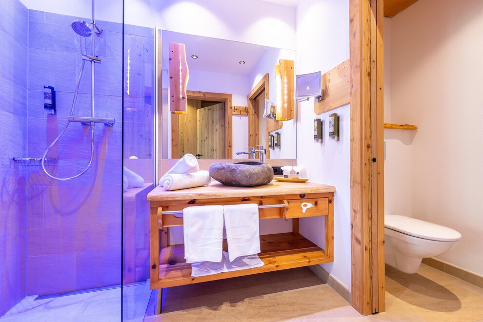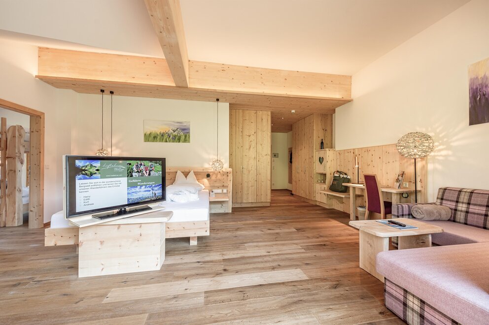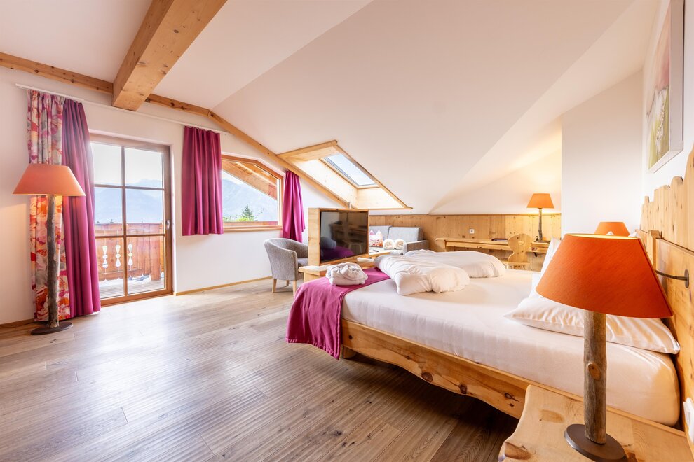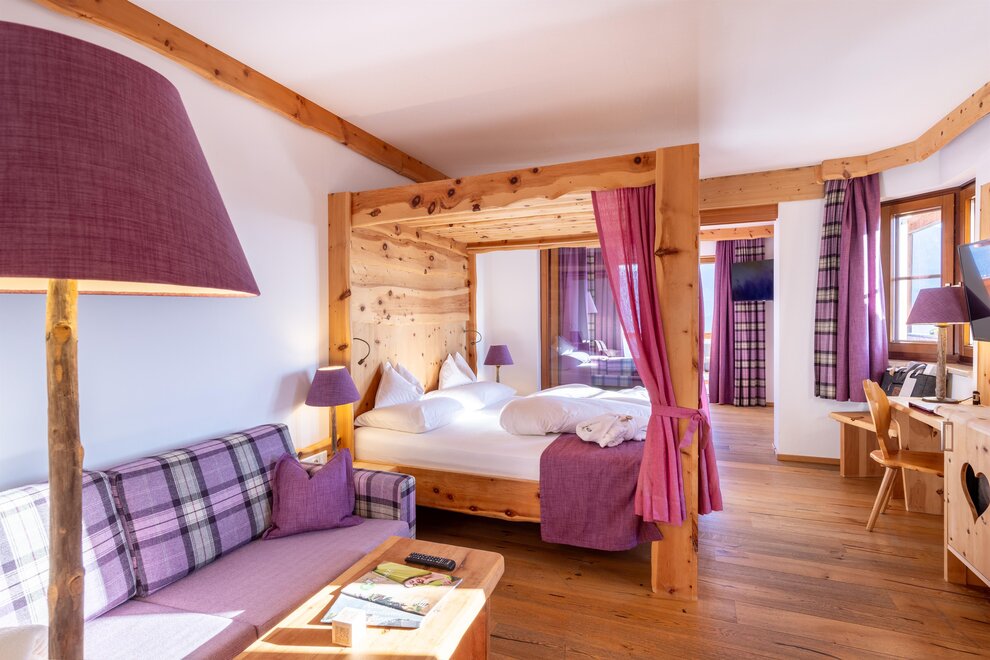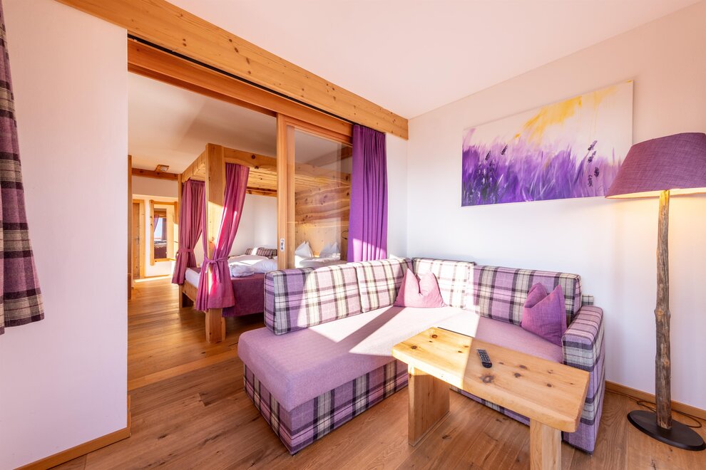 Przeżyj chwile pełne relaksu i dobrego samopoczucia w naszym przestronnym pokoju Lavendel-Superior, z aromatycznymi meblami z drewna cedrowego, łóżkiem w baldachimie na romantyczne chwile, rozkładaną sofą oraz elegancką łazienką z kamieniem i szkłem, dużym, przeszklonym prysznicem i oddzielnym WC. Mały kącik sypialny można oddzielić drzwiami przesuwnymi od reszty pokoju, co czyni go idealnym pokojem rodzinnym. Kolejną atrakcją w pokoju jest duży balkon narożny z widokiem na północ i wschód na imponujące góry.