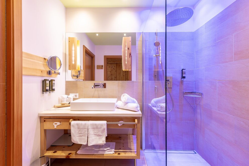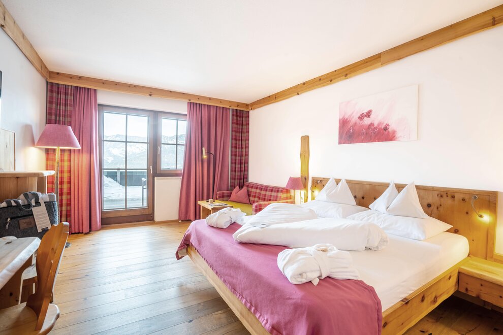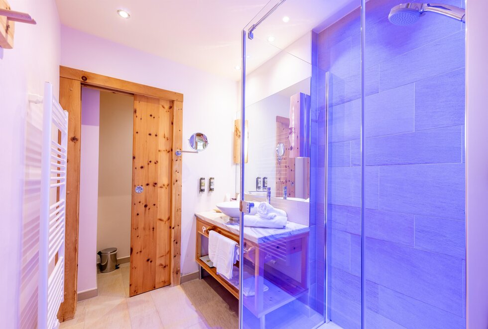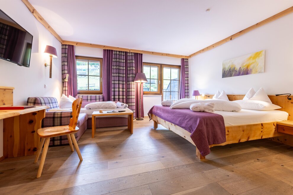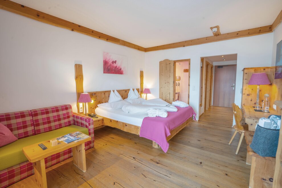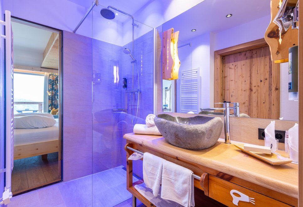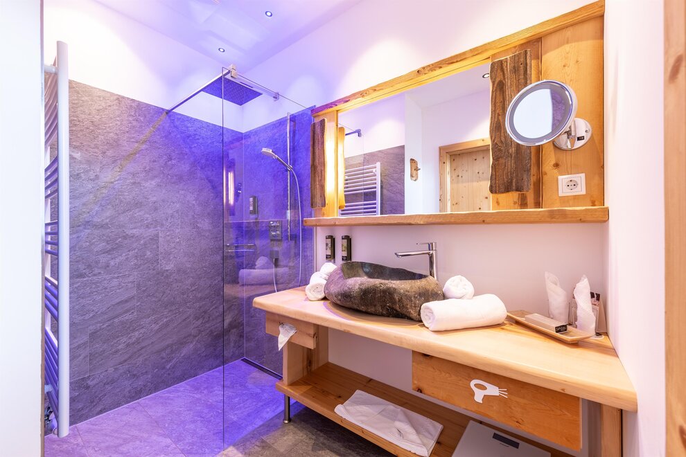 Przeżyj chwile pełne relaksu i dobrego samopoczucia w naszym przestronnym pokoju Lavendel-Superior, z aromatycznymi meblami z drewna cedrowego, łóżkiem w baldachimie na romantyczne chwile, rozkładaną sofą oraz elegancką łazienką z kamieniem i szkłem, dużym, przeszklonym prysznicem i oddzielnym WC. Mały kącik sypialny można oddzielić drzwiami przesuwnymi od reszty pokoju, co czyni go idealnym pokojem rodzinnym. Kolejną atrakcją w pokoju jest duży balkon narożny z widokiem na północ i wschód na imponujące góry.