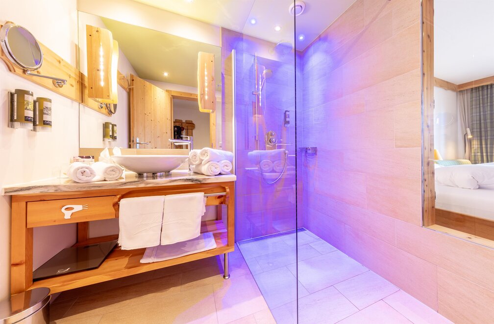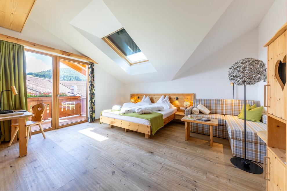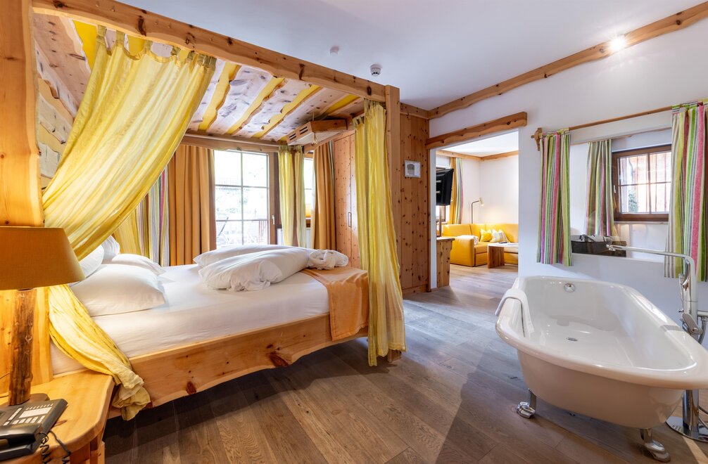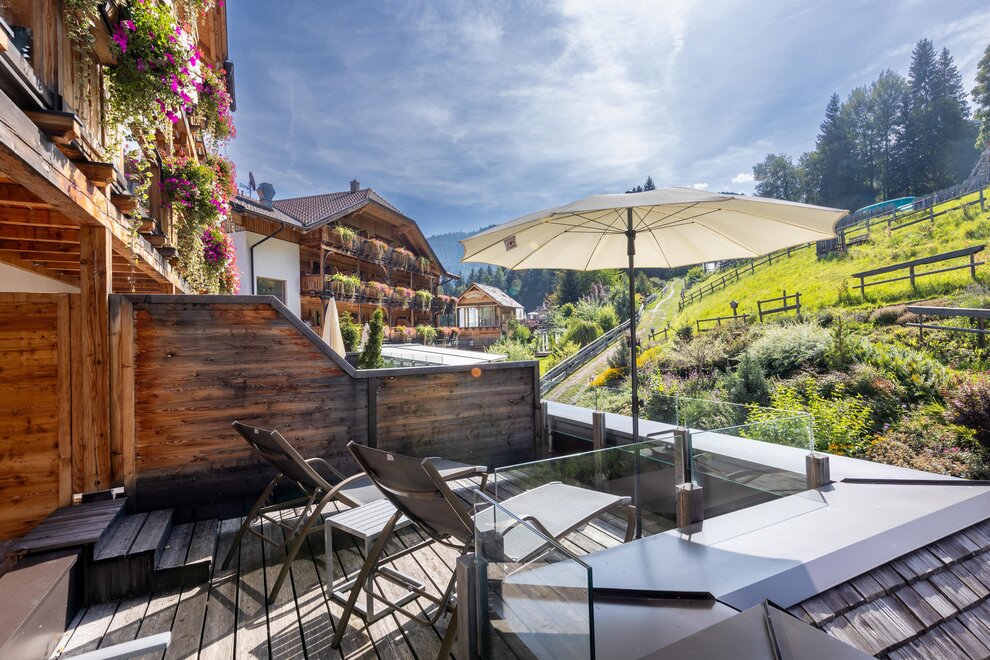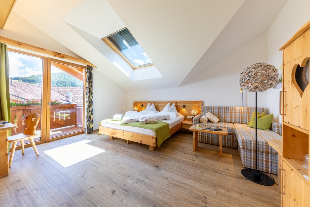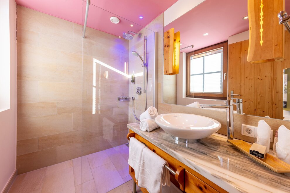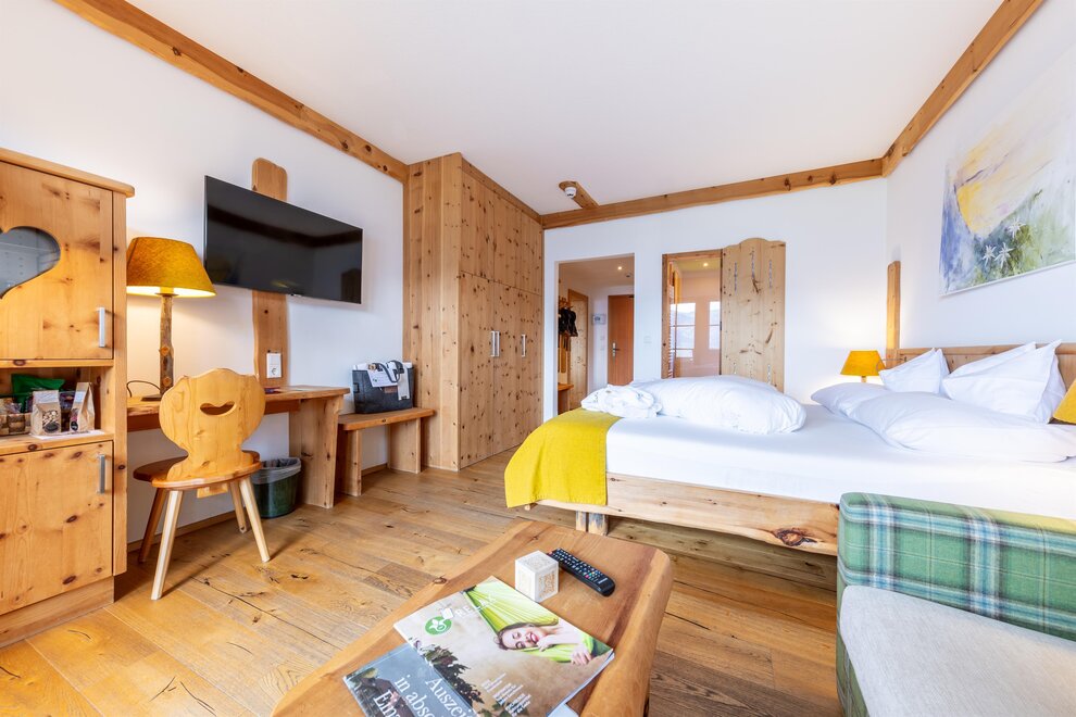 Przeżyj chwile pełne relaksu i dobrego samopoczucia w naszym przestronnym pokoju Lavendel-Superior, z aromatycznymi meblami z drewna cedrowego, łóżkiem w baldachimie na romantyczne chwile, rozkładaną sofą oraz elegancką łazienką z kamieniem i szkłem, dużym, przeszklonym prysznicem i oddzielnym WC. Mały kącik sypialny można oddzielić drzwiami przesuwnymi od reszty pokoju, co czyni go idealnym pokojem rodzinnym. Kolejną atrakcją w pokoju jest duży balkon narożny z widokiem na północ i wschód na imponujące góry.