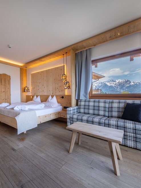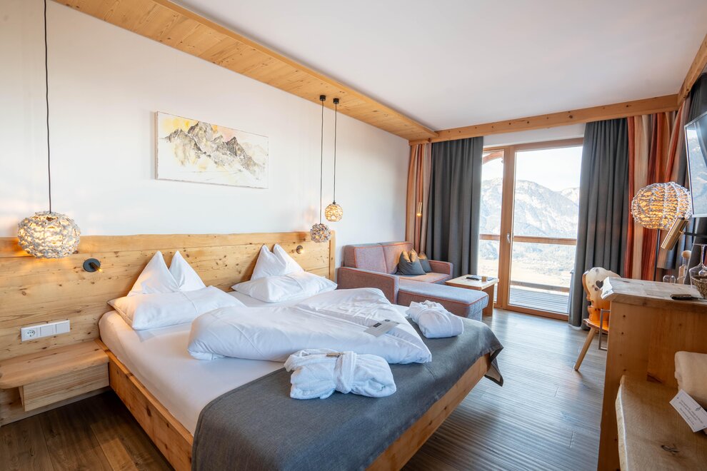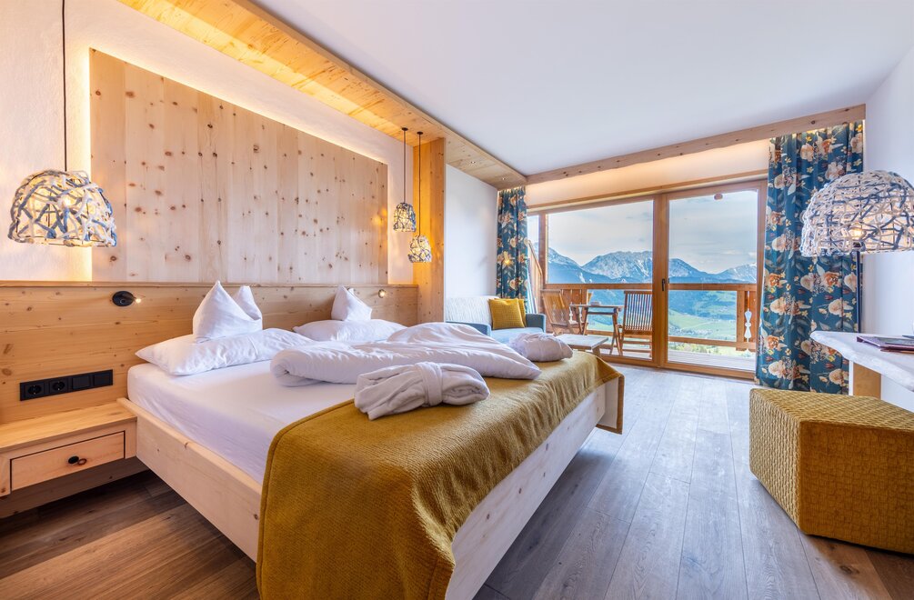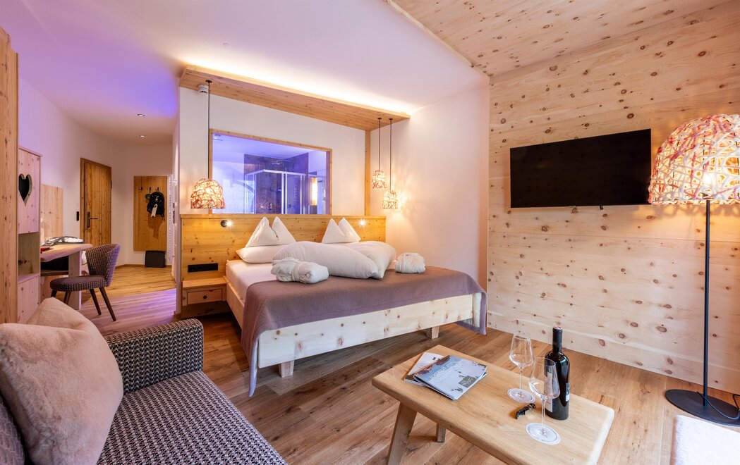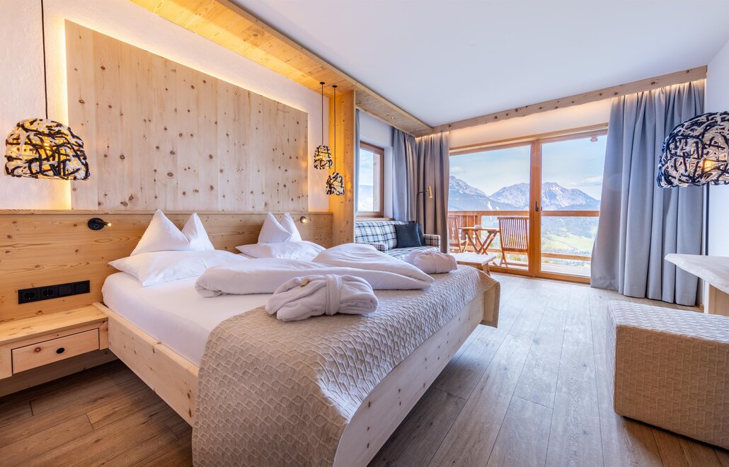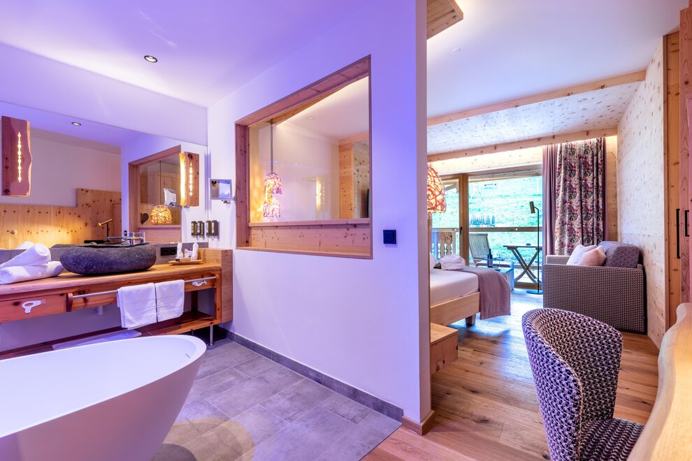 Z tego pokoju można podziwiać zapierający dech w piersiach widok gór w promieniu 180 stopni: widok, gdzie sięga oko - zwłaszcza z narożnego balkonu! Modny alpejski styl z surowym drewnem cisa i starym drewnem, wysokiej jakości materiałami i szlachetnymi detalami sprawia, że ten pokój jest idealną oazą relaksu. W łazience znajdują się solidne drewno i kamień naturalny.